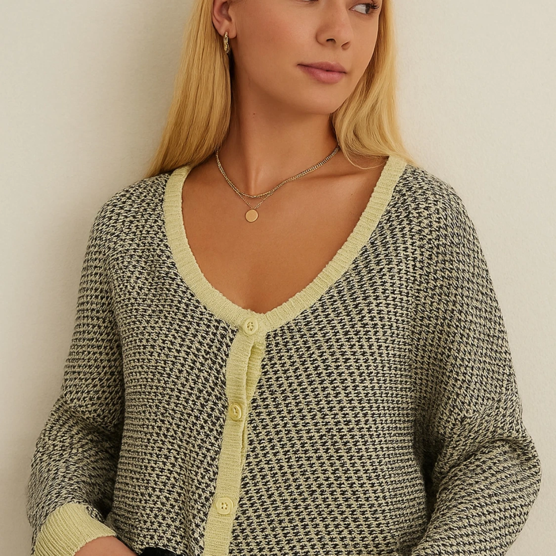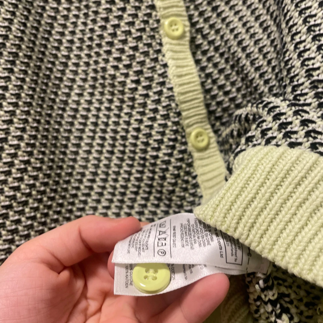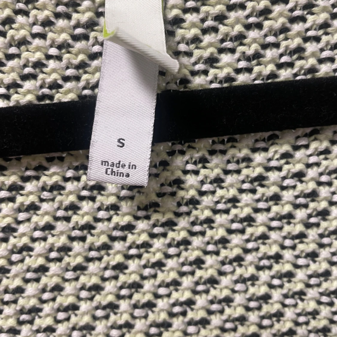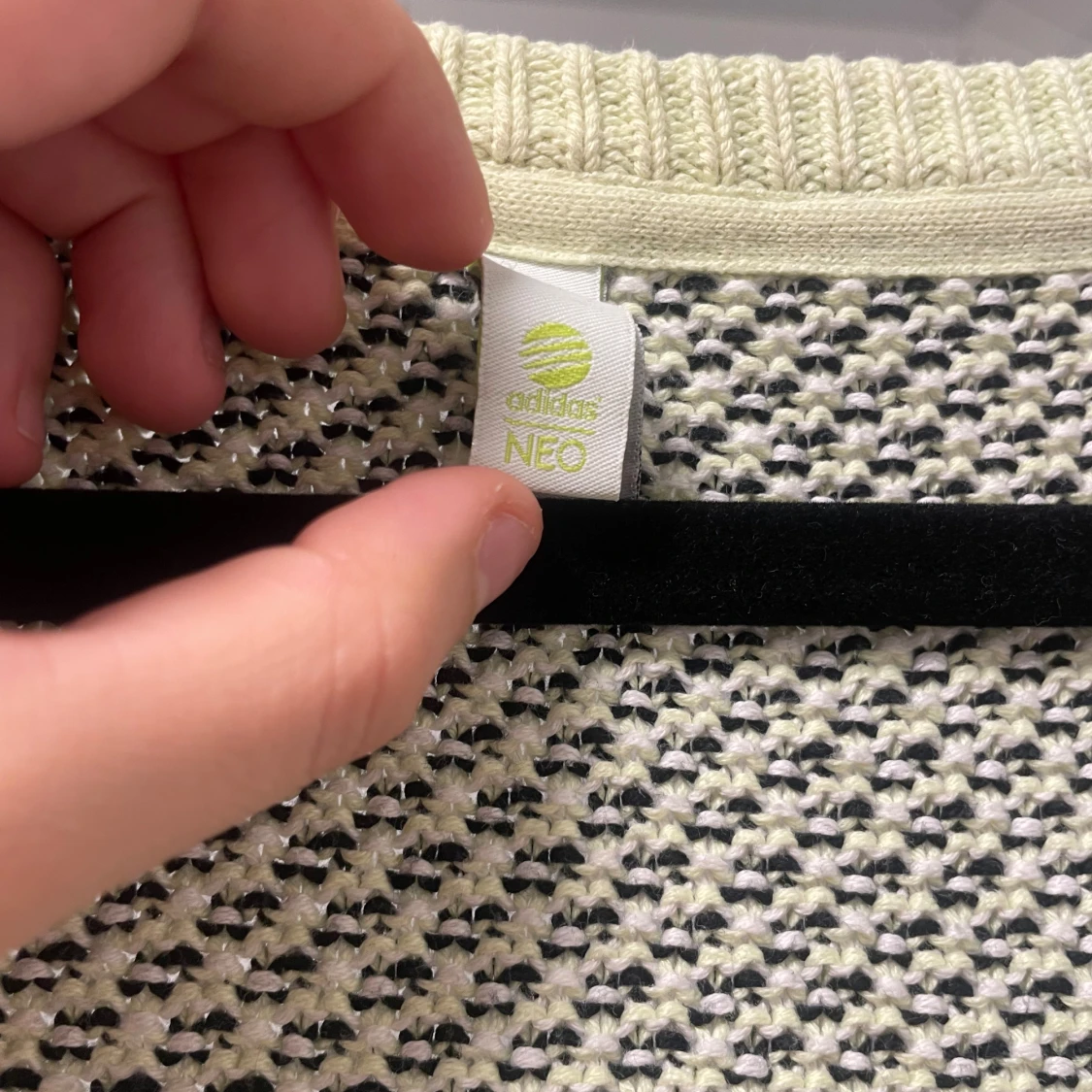 Säljer en svartvit kofta från adidas NEO i storlek S. Koftan har ett rutigt mönster, ljusgula ribbade kanter och knappar framtill. Modellen är loose fit med långärmade ärmar och v-ringad hals. Perfekt för dig som gillar chill och stilren look.