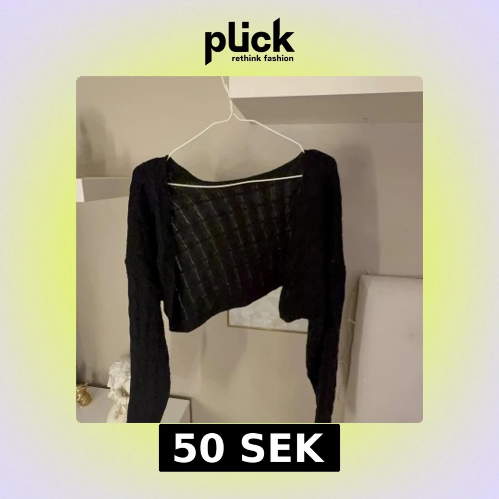 Säljer en svart croppad stickad tröja med lång ärm och bred halsringning. Tröjan har ett diskret rutigt mönster i stickningen och är perfekt för lager-på-lager. Passformen är loose och den är riktigt skön att ha på sig. Fel storlek för mig