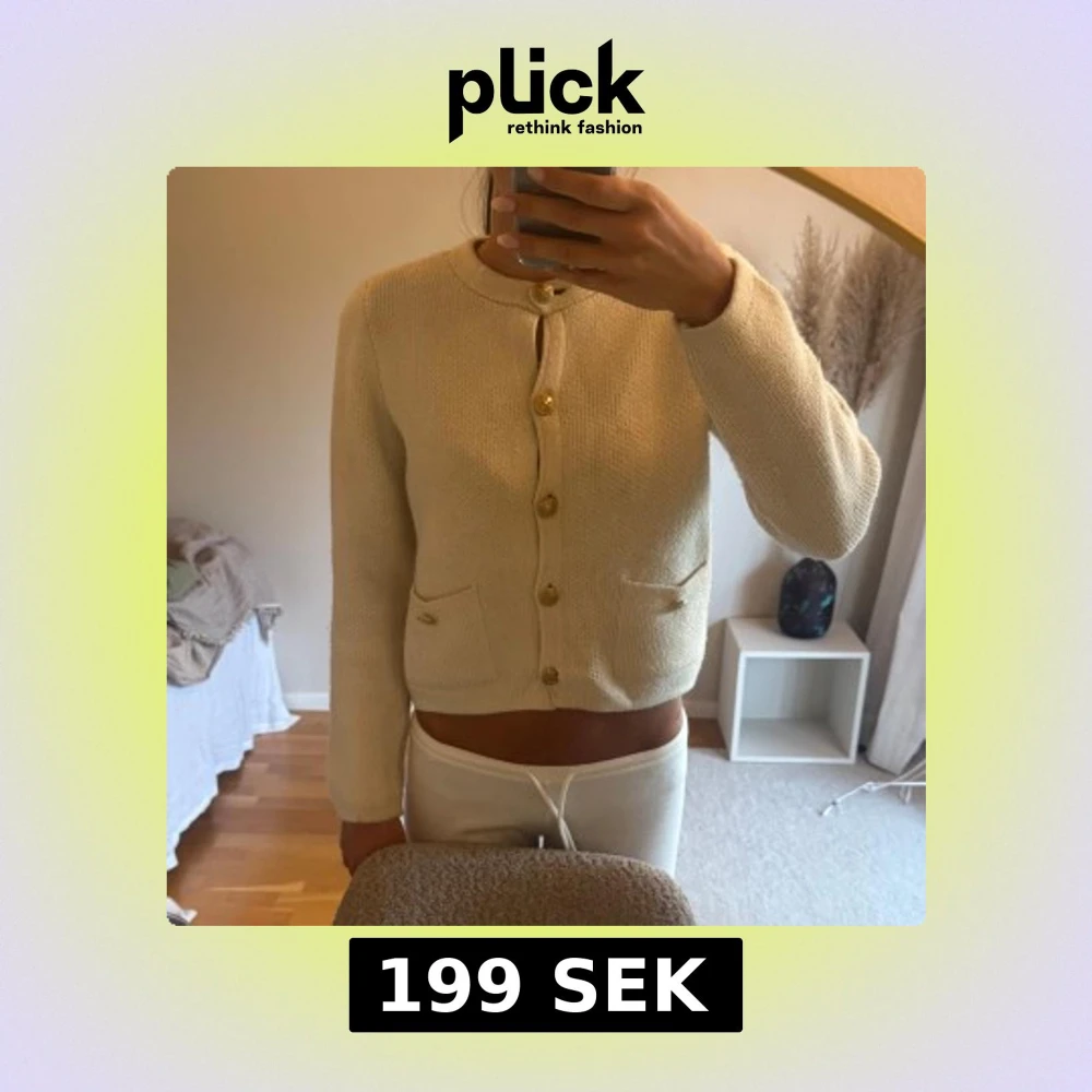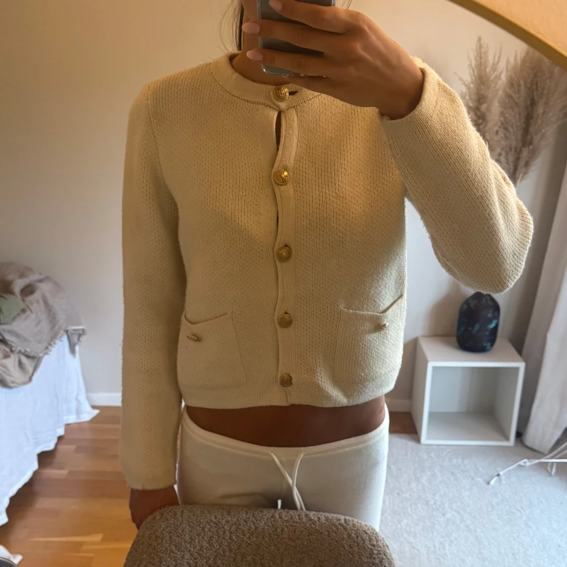 SĂ€ljer creamevit stickad kofta med guldknappar đ„° passar perfekt till hösten