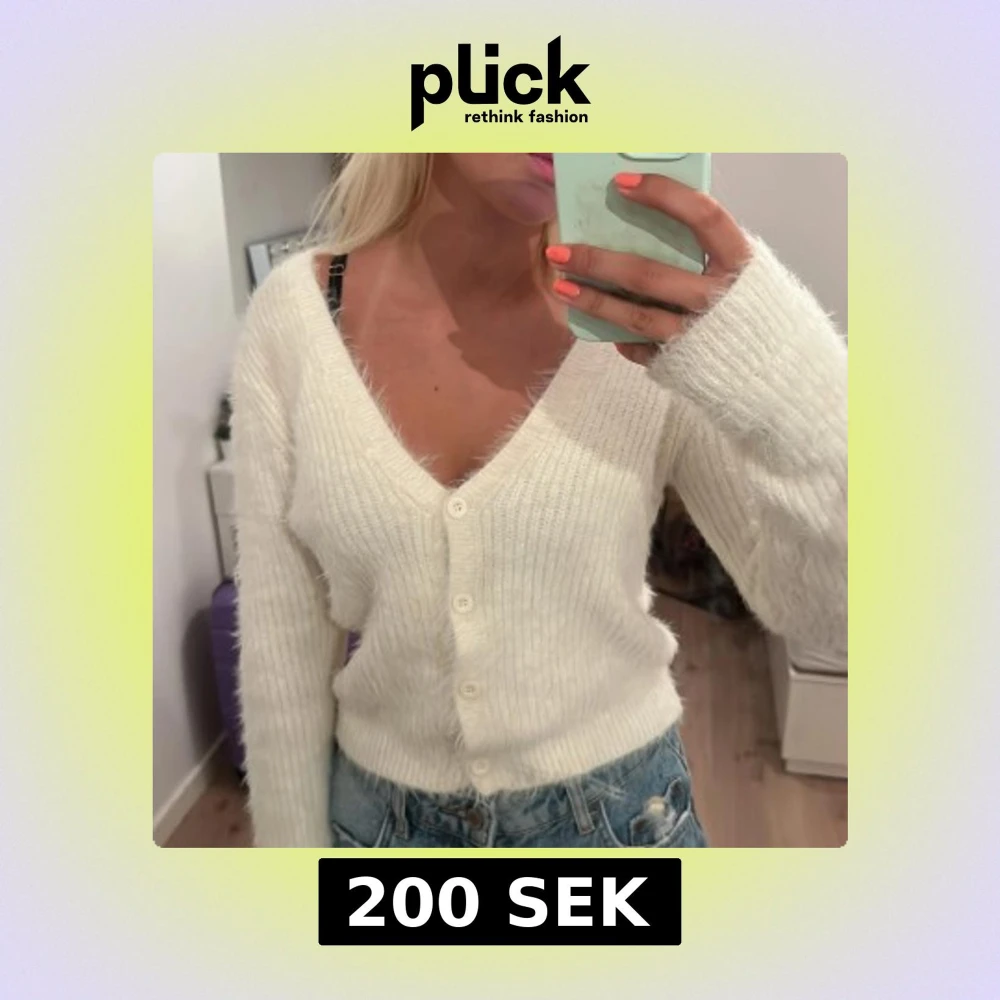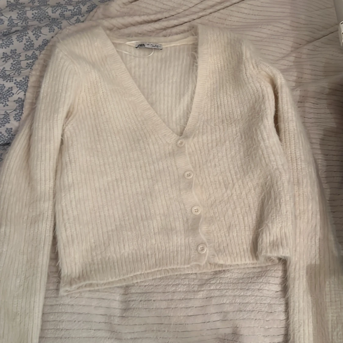 Supermjuk och fluffig vit kofta från Zara med v-ringning och knappar framtill. Croppad modell med långa ärmar.