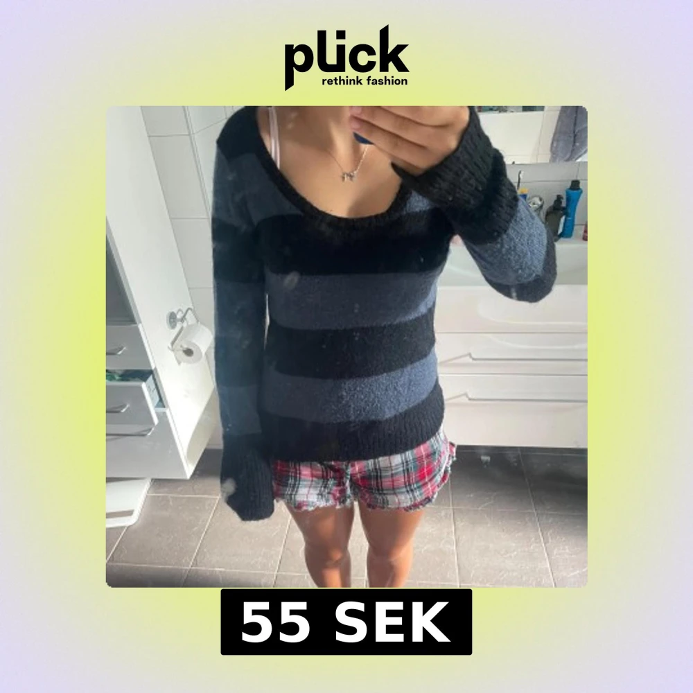 Mysig stickad tröja med breda horisontella ränder i mörkblått och svart. Tröjan har en djup rundad halsringning och långa ärmar med ribbade muddar. Perfekt för dig som gillar chill och enkel stil med lite edge.