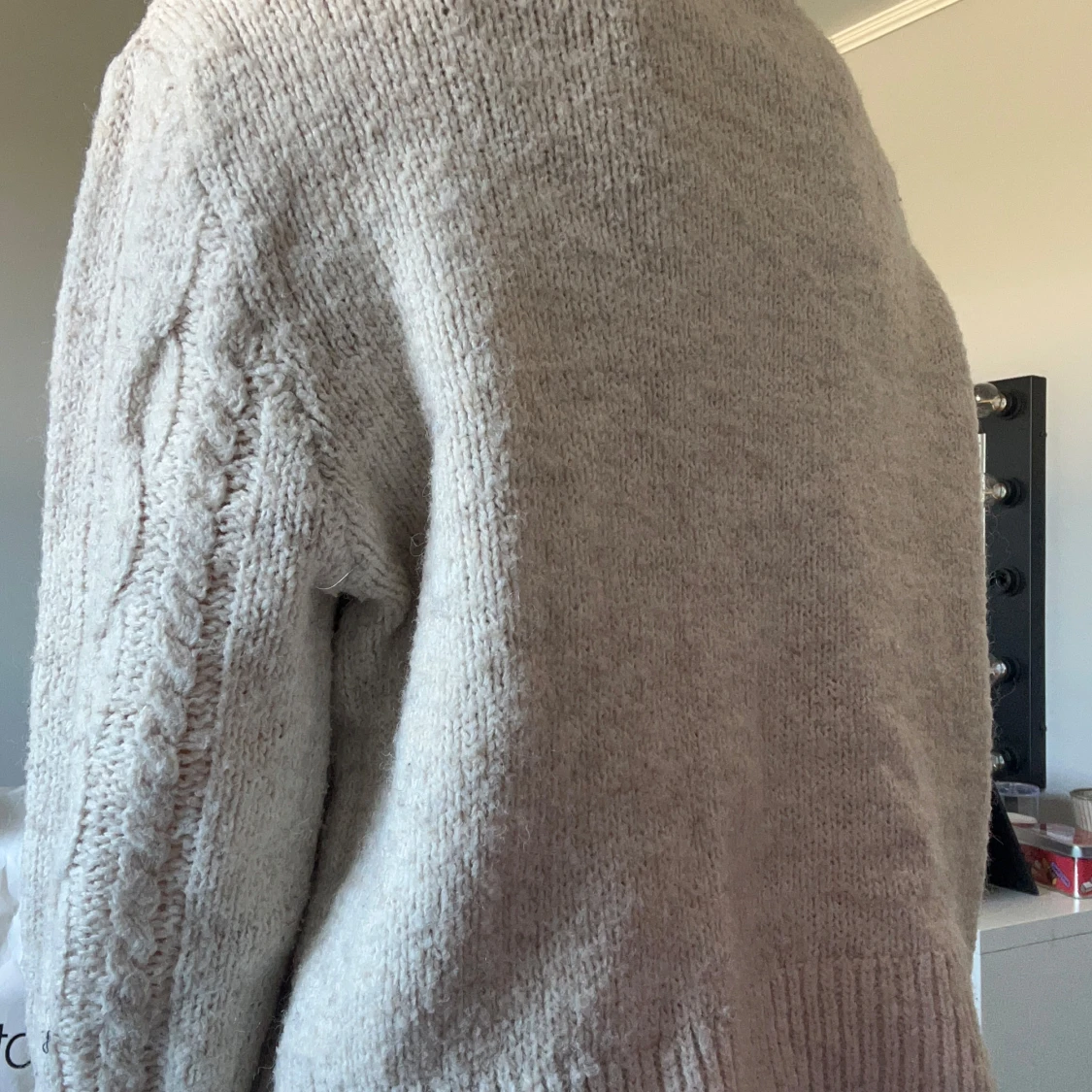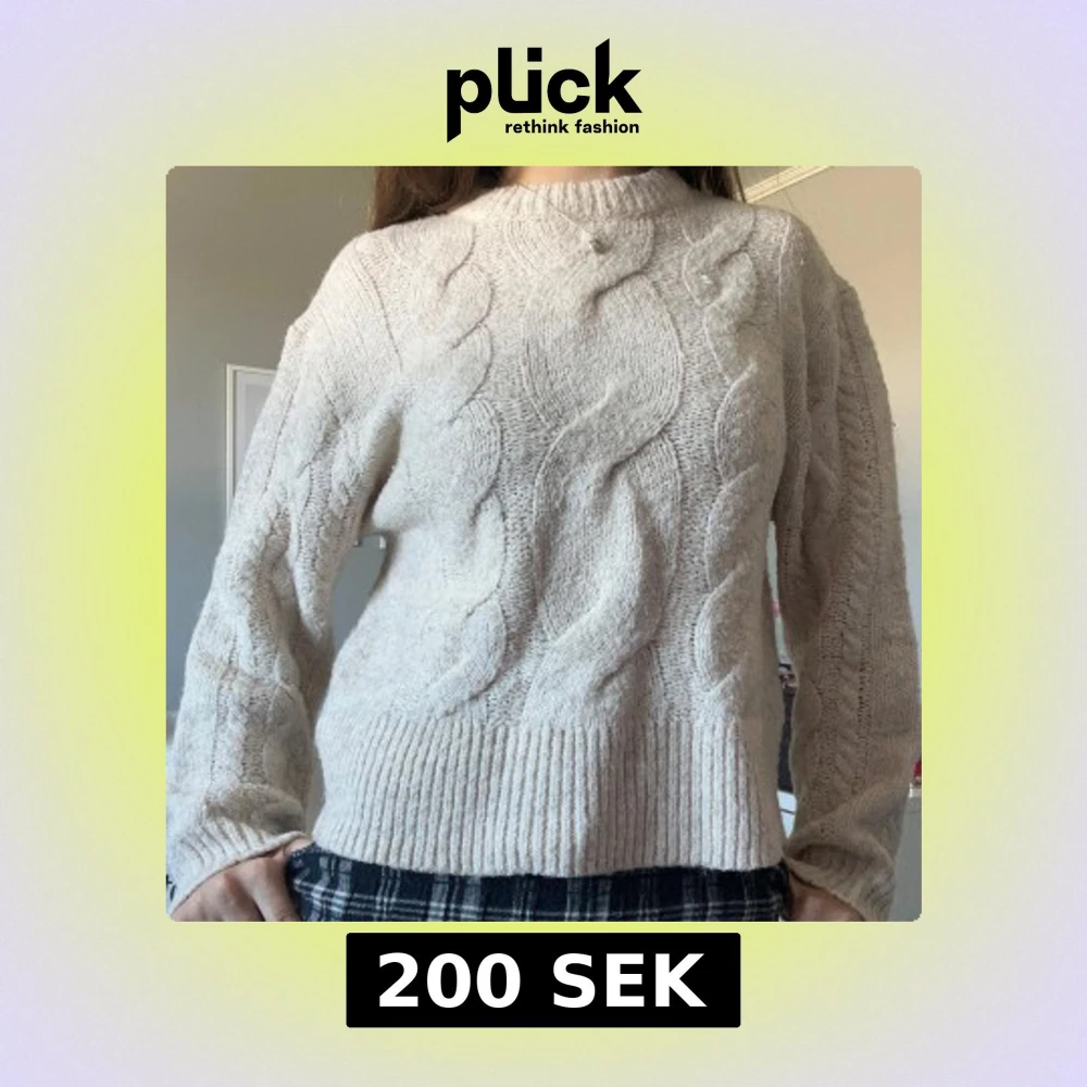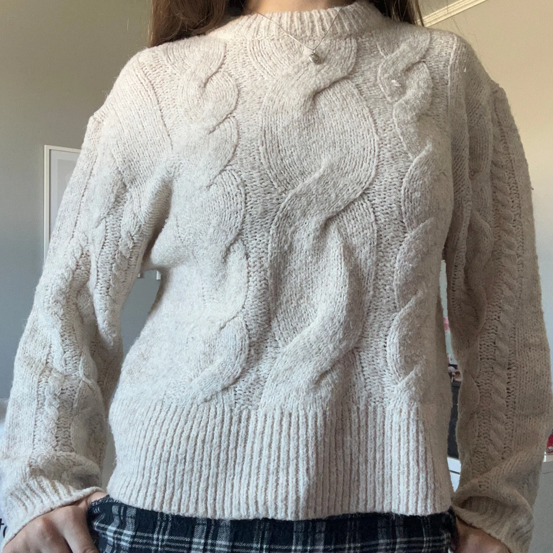 Mysig beige stickad tröja med grovt kabelmönster framtill och på ärmarna. Tröjan har rund hals och långa ärmar med ribbade muddar. Perfekt för kyliga dagar när du vill vara både bekväm och snygg. Storlek 146/152 men passar mig som har xxs/xs