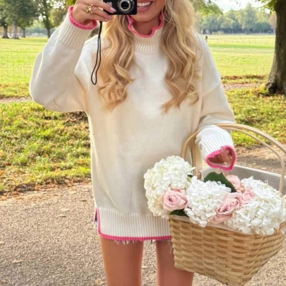 Superfin vit stickad polotröja med rosa längst kanterna. Från Filippa Montans kollektion med meet me there. Helt oanvänd endast testad.