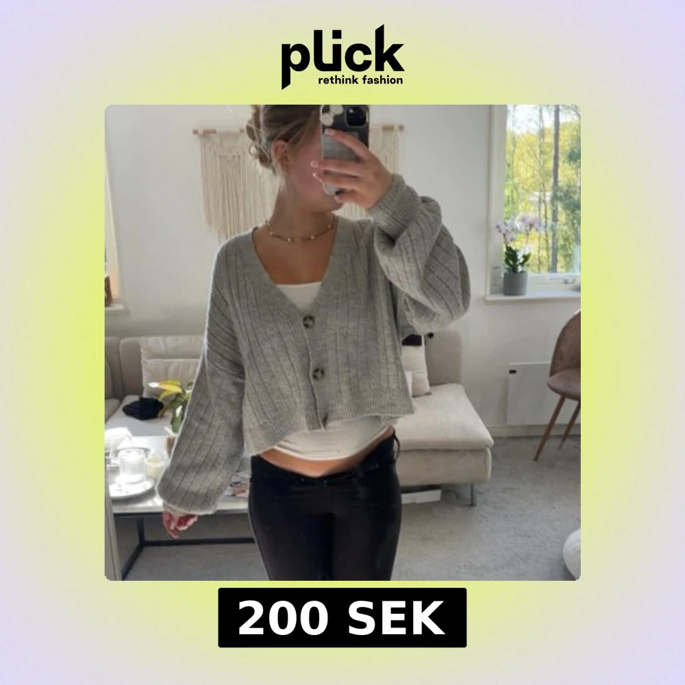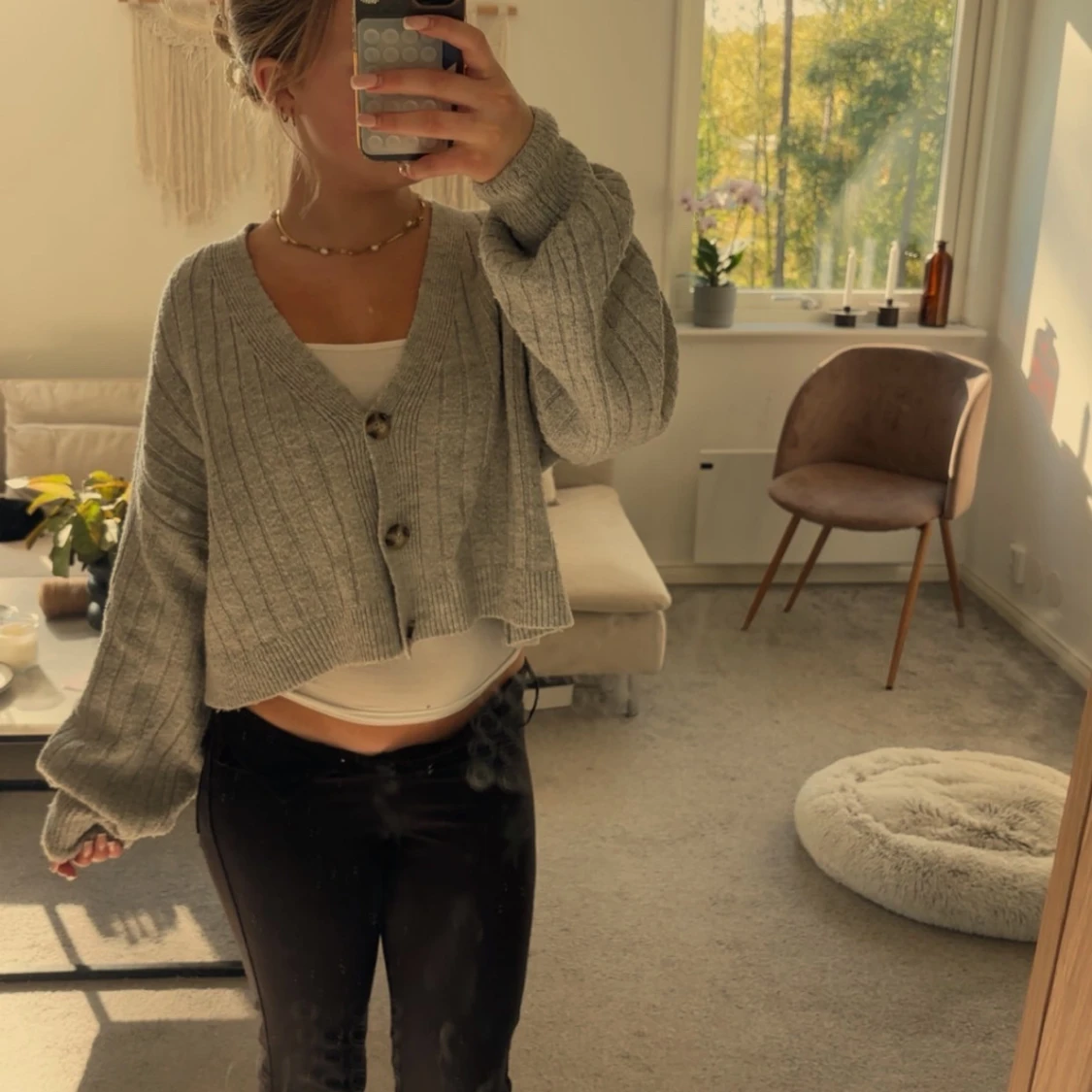 Supermysig grå kofta från stradivarius med breda ribbade ränder och stora knappar framtill. Croppad modell med v-ringning och långa, lite pösiga ärmar. Perfekt att slänga över ett linne eller t-shirt för en chill look.