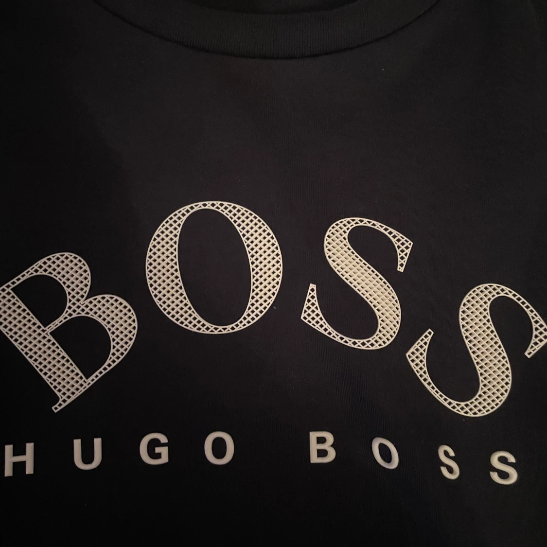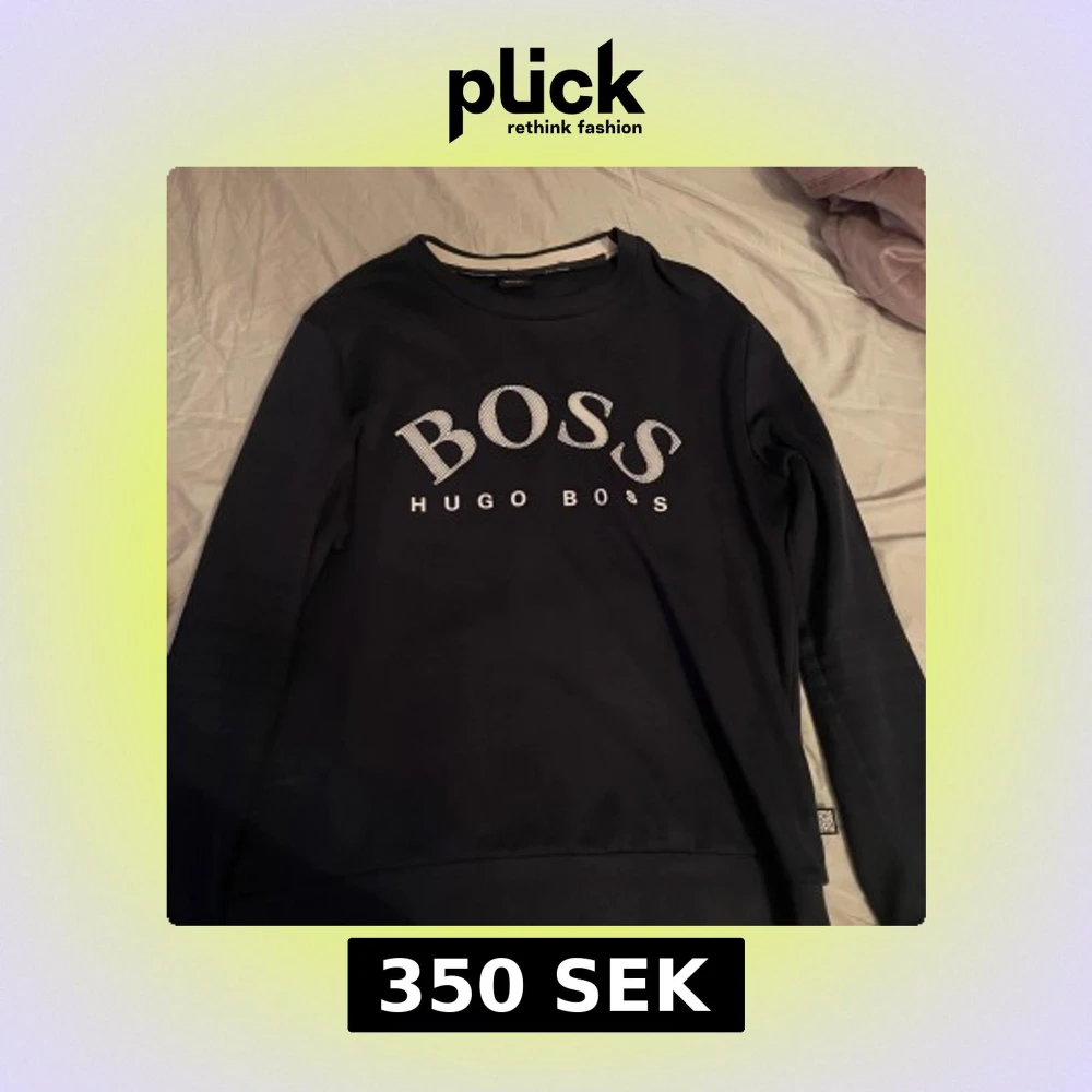 Säljer en svart sweatshirt från Hugo Boss med stort vitt BOSS-tryck på bröstet. Tröjan har rund halsringning och långa ärmar. Perfekt för en stilren och avslappnad look. Tröjan passar suveränt till storlek M också.