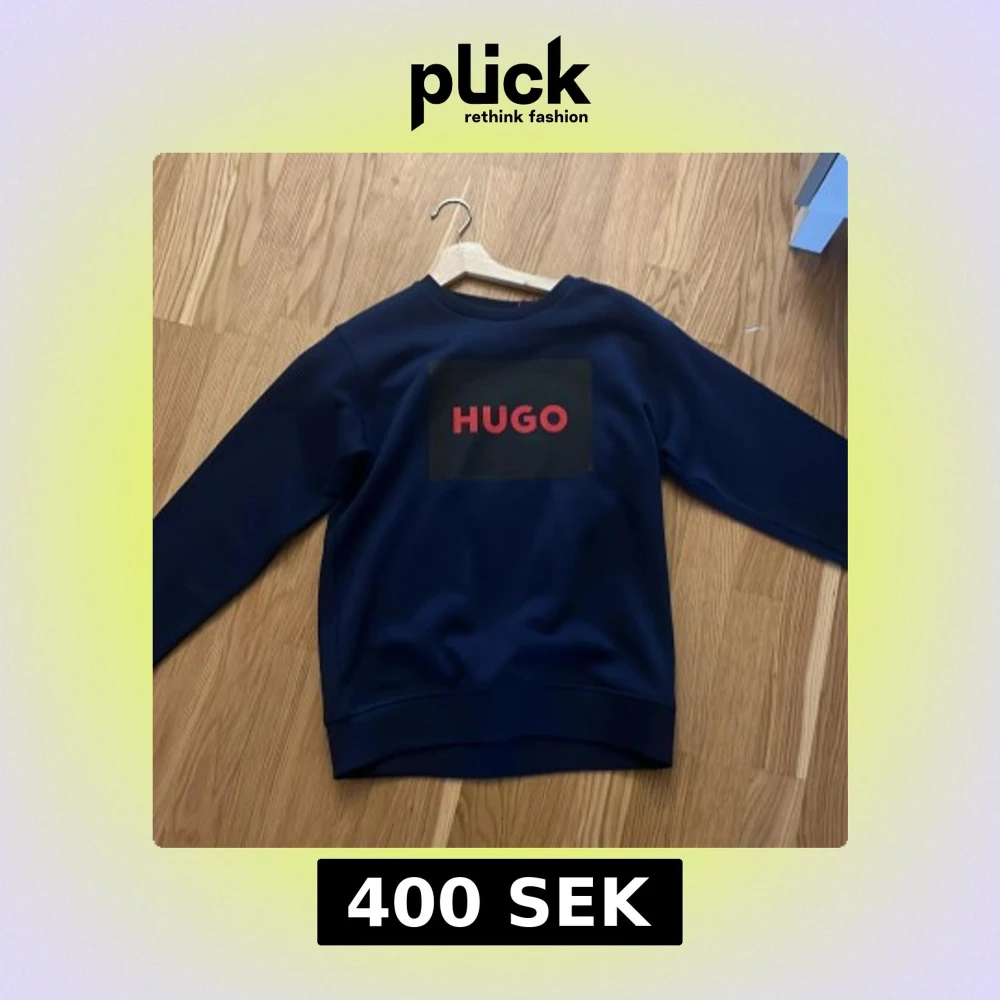 Säljer en mörkblå sweatshirt från Hugo med stor röd logga framtill. Tröjan har rund halsringning och långa ärmar. Perfekt för en stilren och avslappnad look.