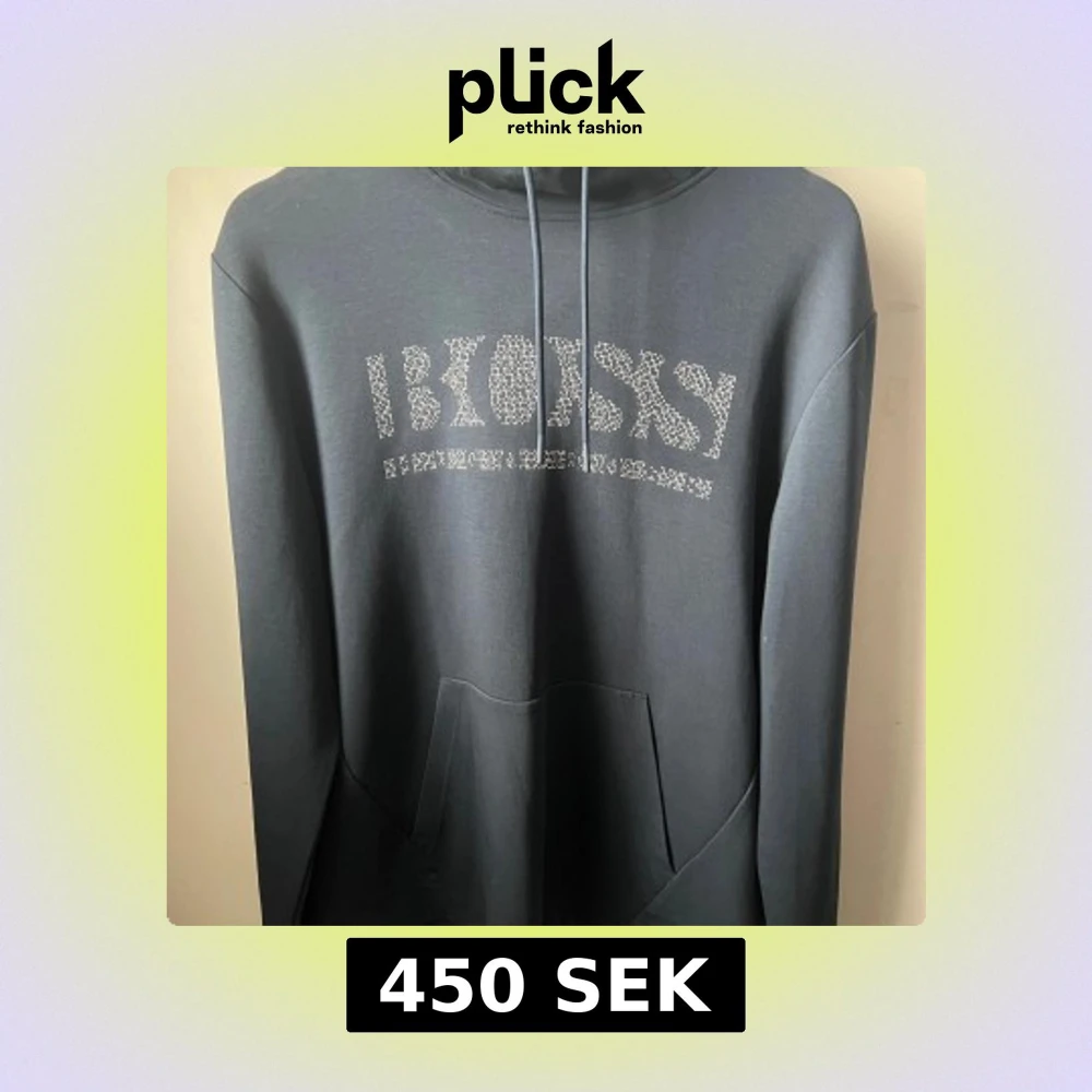 Snygg mörkblå hoodie från Hugo Boss i storlek XL. Tröjan har ett stort BOSS-tryck framtill i små silvriga prickar, klassisk huva med snörning och en stor magficka. Perfekt för dig som gillar stilrena och bekväma plagg.