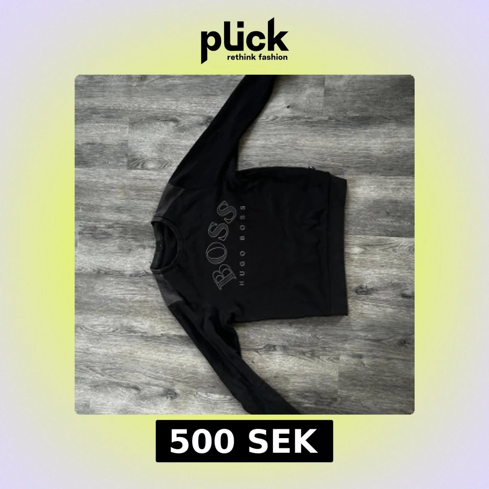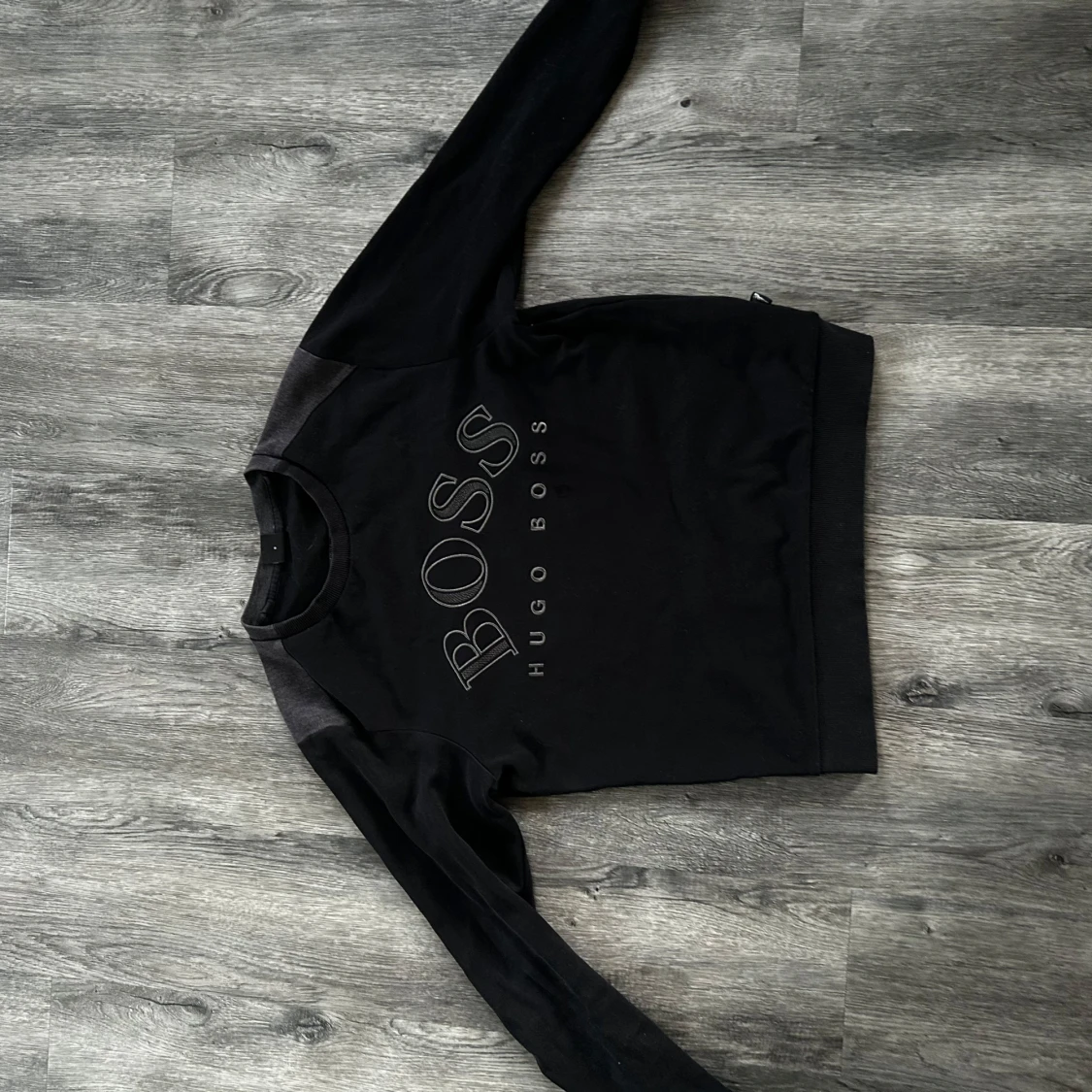 Säljer en stilren svart tröja från Hugo Boss med deras logga tryckt på framsidan. Tröjan har långa ärmar och en klassisk rund halsringning. Perfekt för en avslappnad och trendig look.