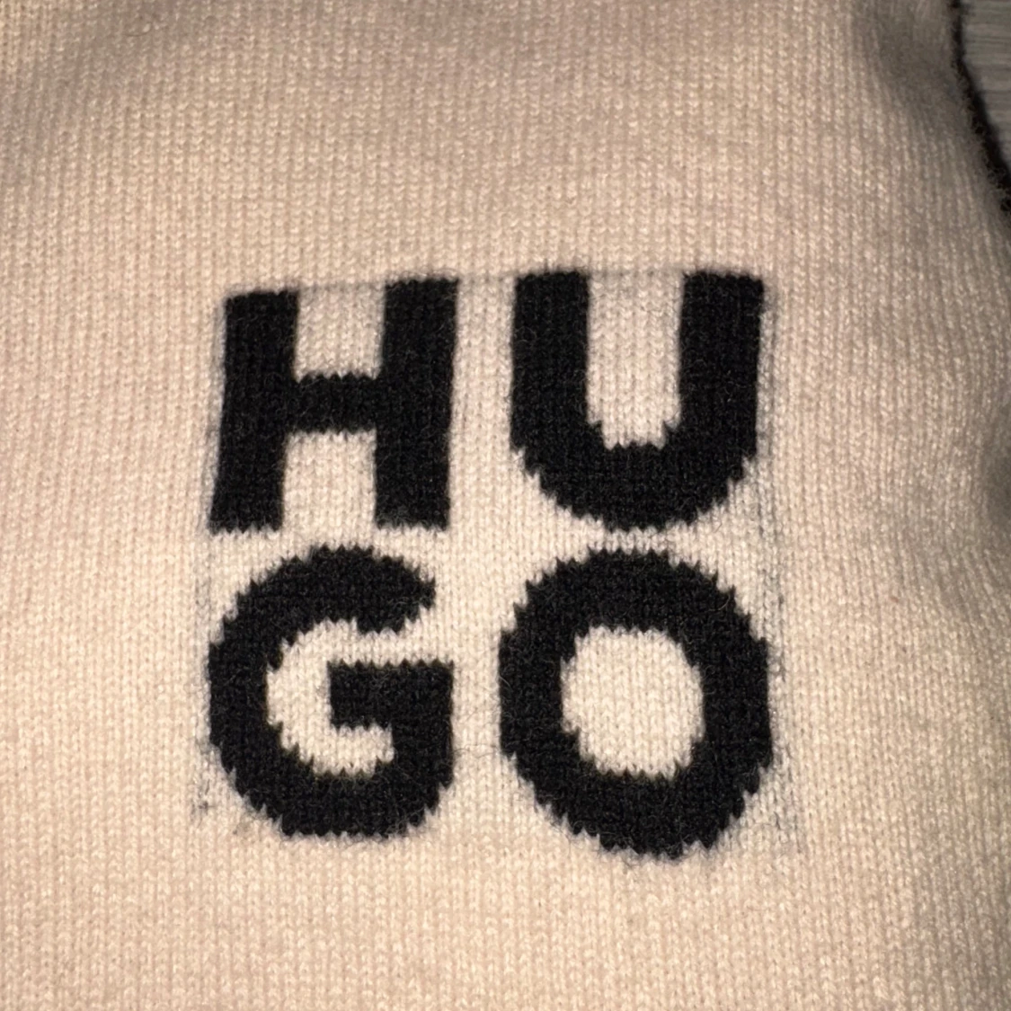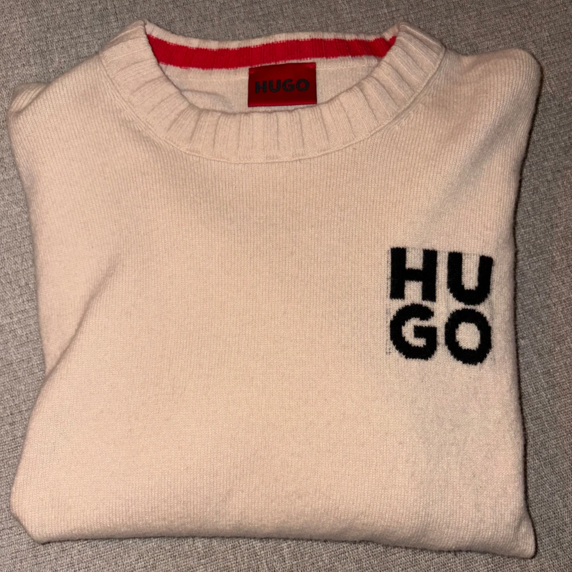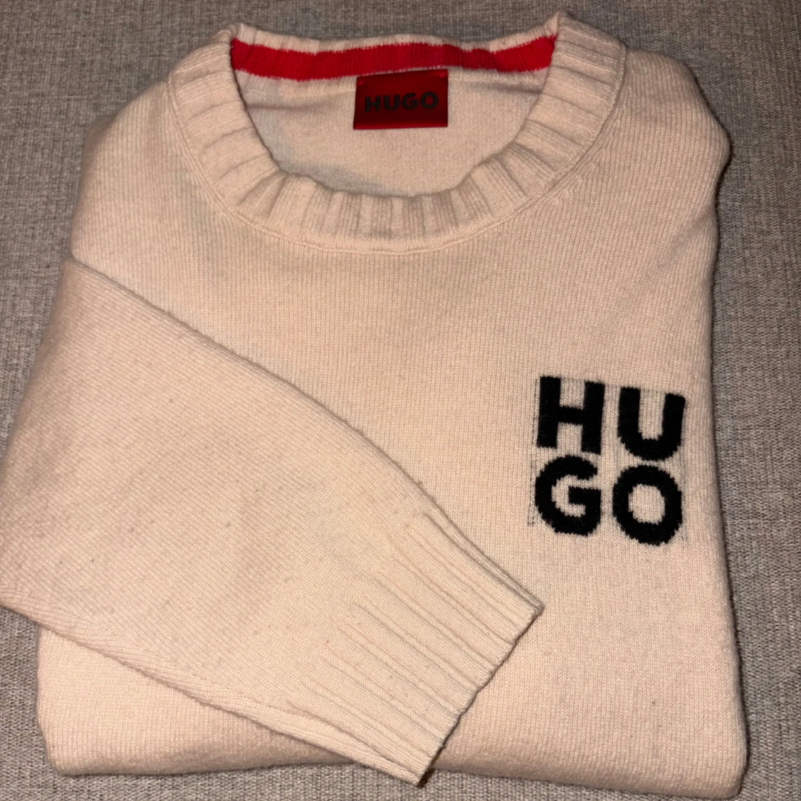 Säljer en stilren beige tröja från Hugo boss med svart logotyp på bröstet. Tröjan har en rund halsringning och långa ärmar. Perfekt för en avslappnad och trendig look. Storlek L. Nypris (1800kr)