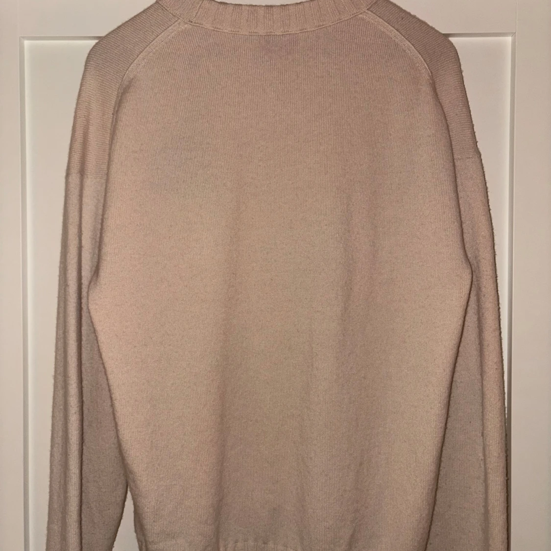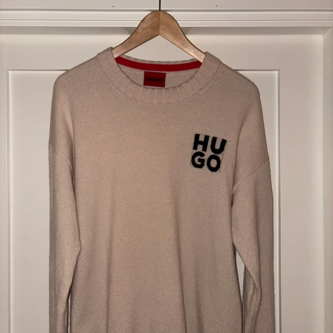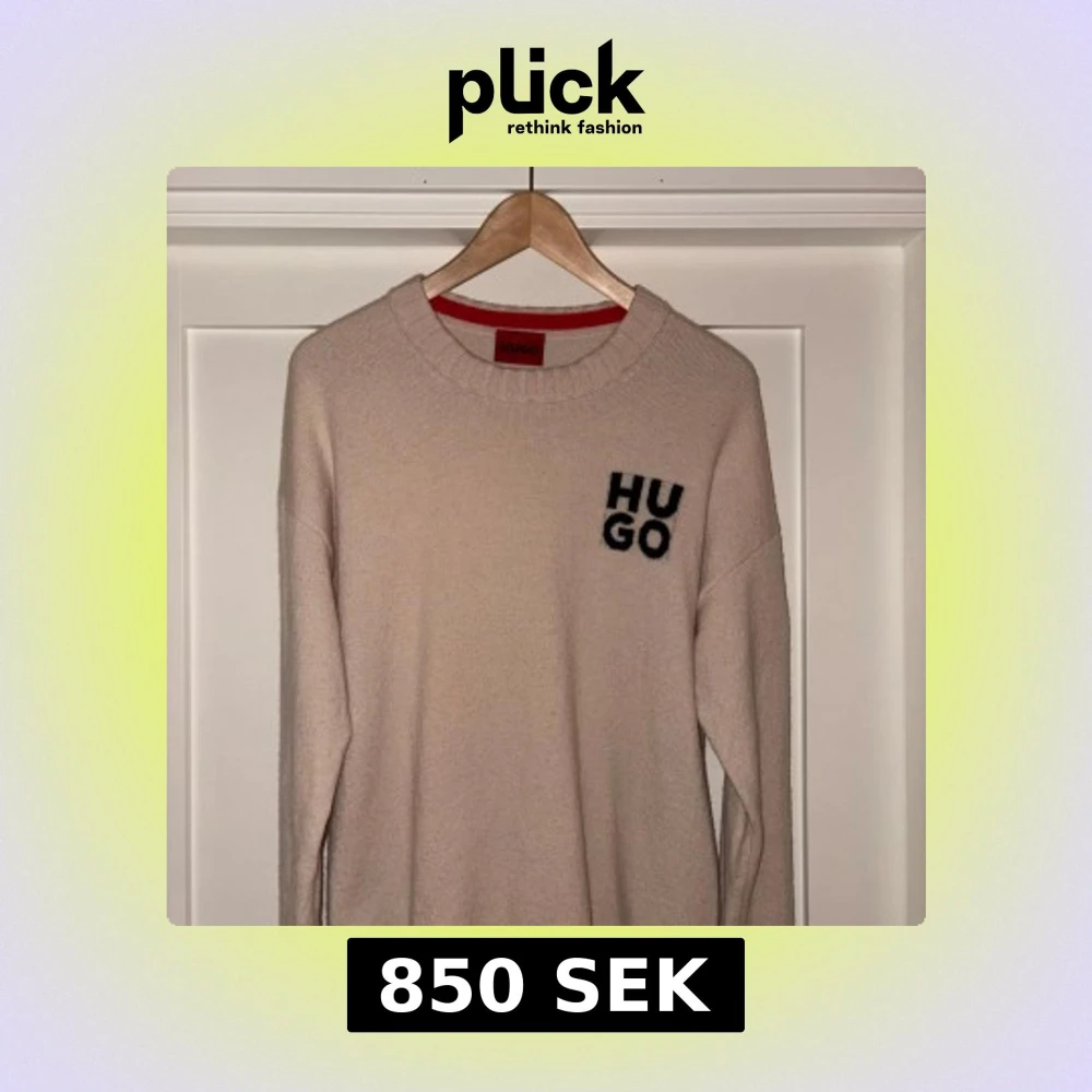 Säljer en stilren beige tröja från Hugo boss med svart logotyp på bröstet. Tröjan har en rund halsringning och långa ärmar. Perfekt för en avslappnad och trendig look. Storlek L. Nypris (1800kr)