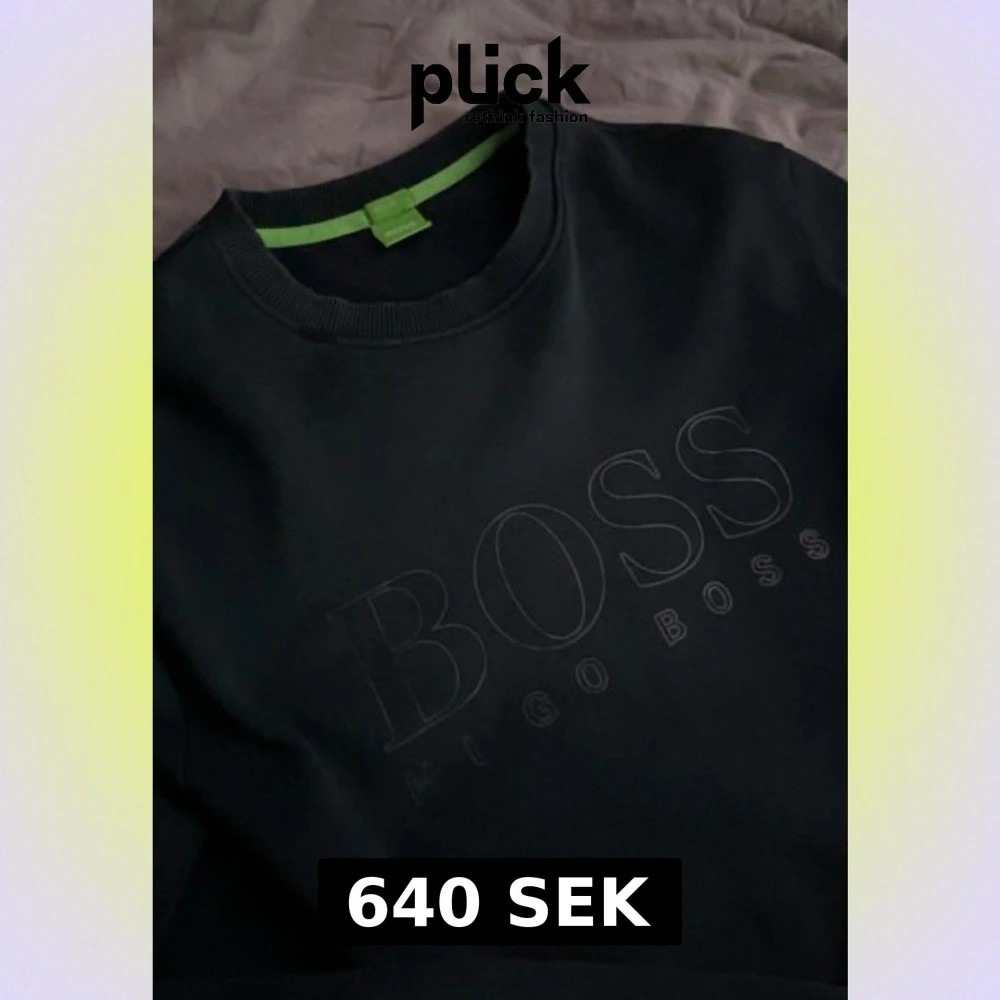 Svart sweatshirt från Hugo Boss i storlek L med stilren BOSS-logga ton-i-ton på bröstet. Tröjan har rund hals, ribbade muddar och regular fit. Materialet är mjuk bomull och polyester, perfekt för chill dagar. Grön detalj på insidan av kragen ger en snygg kontrast.