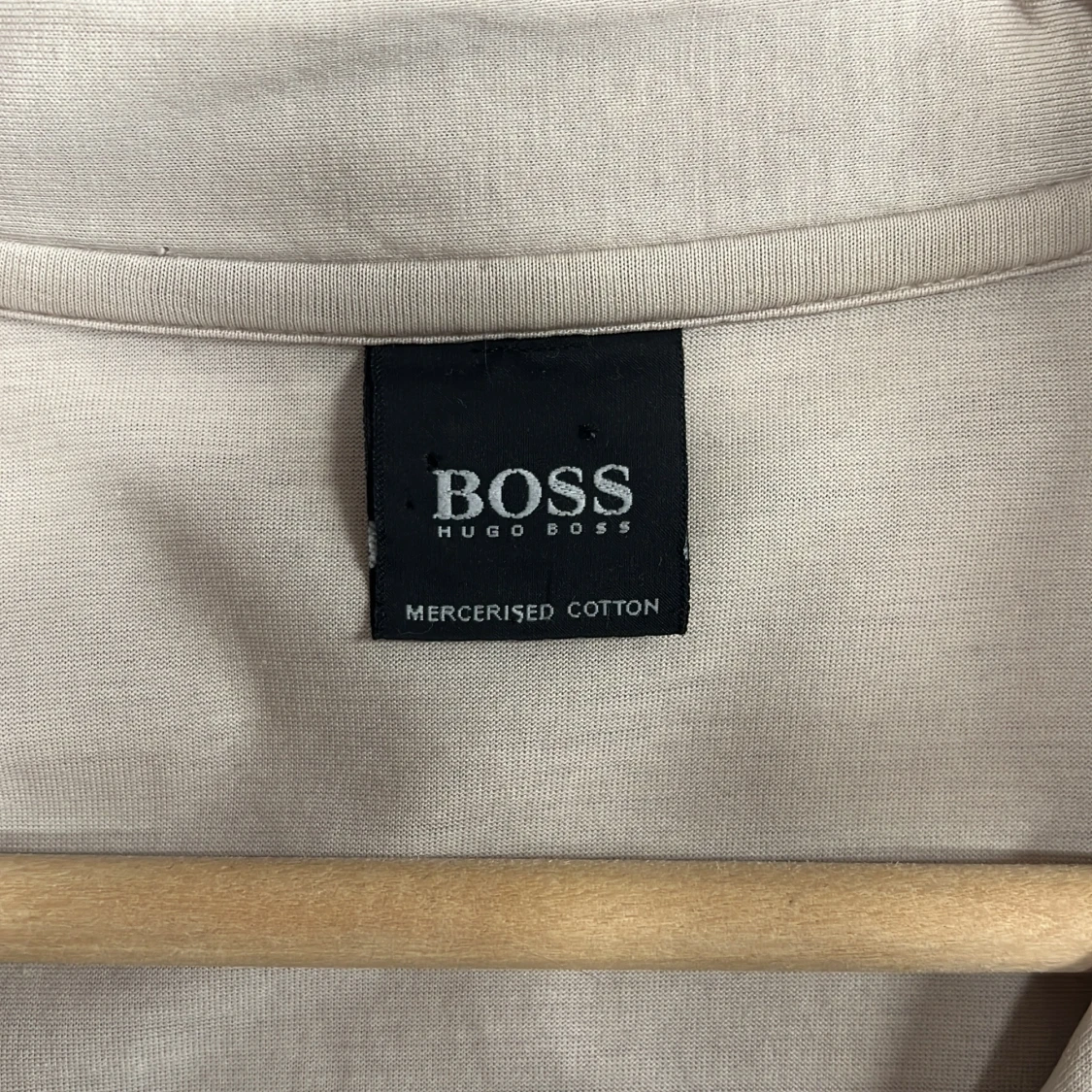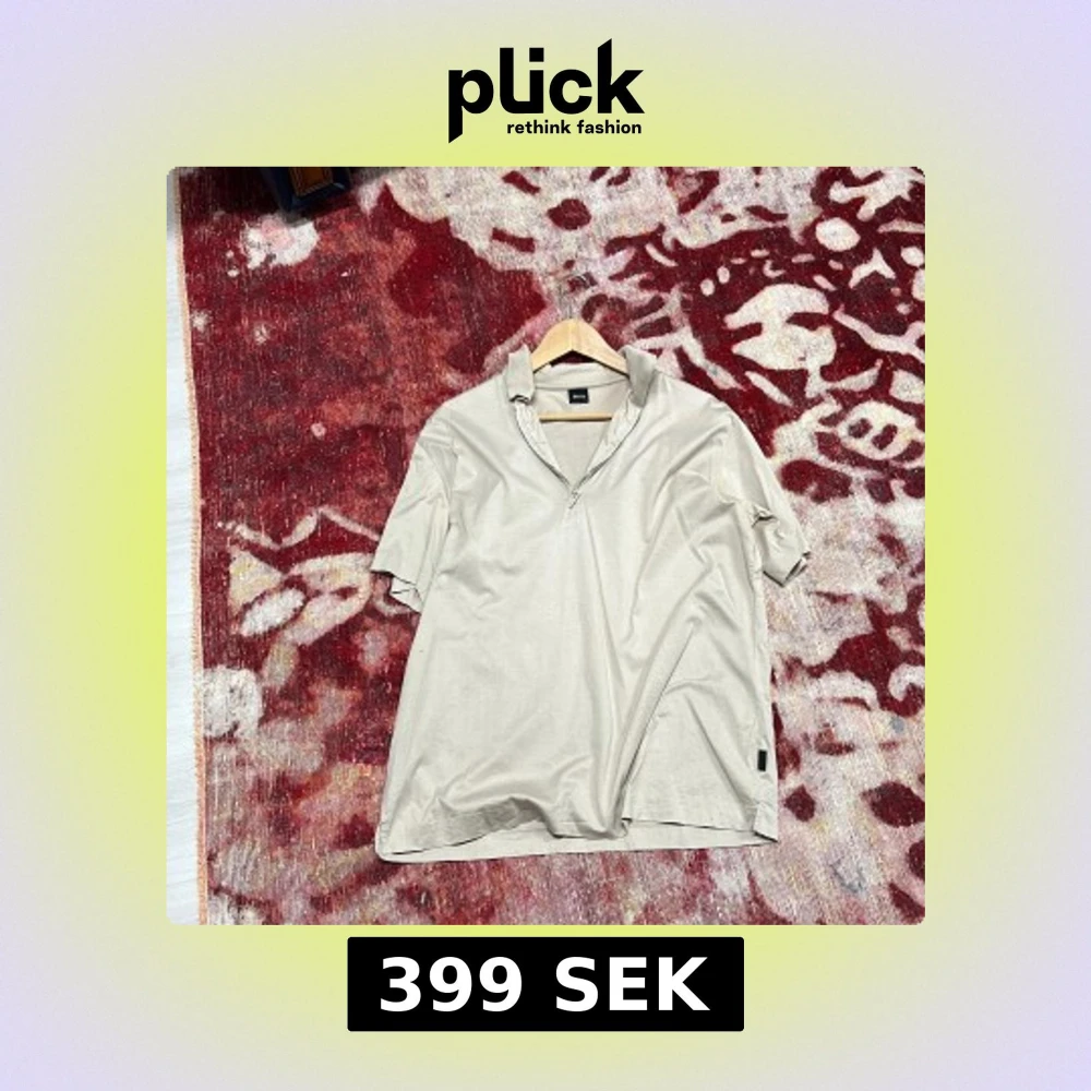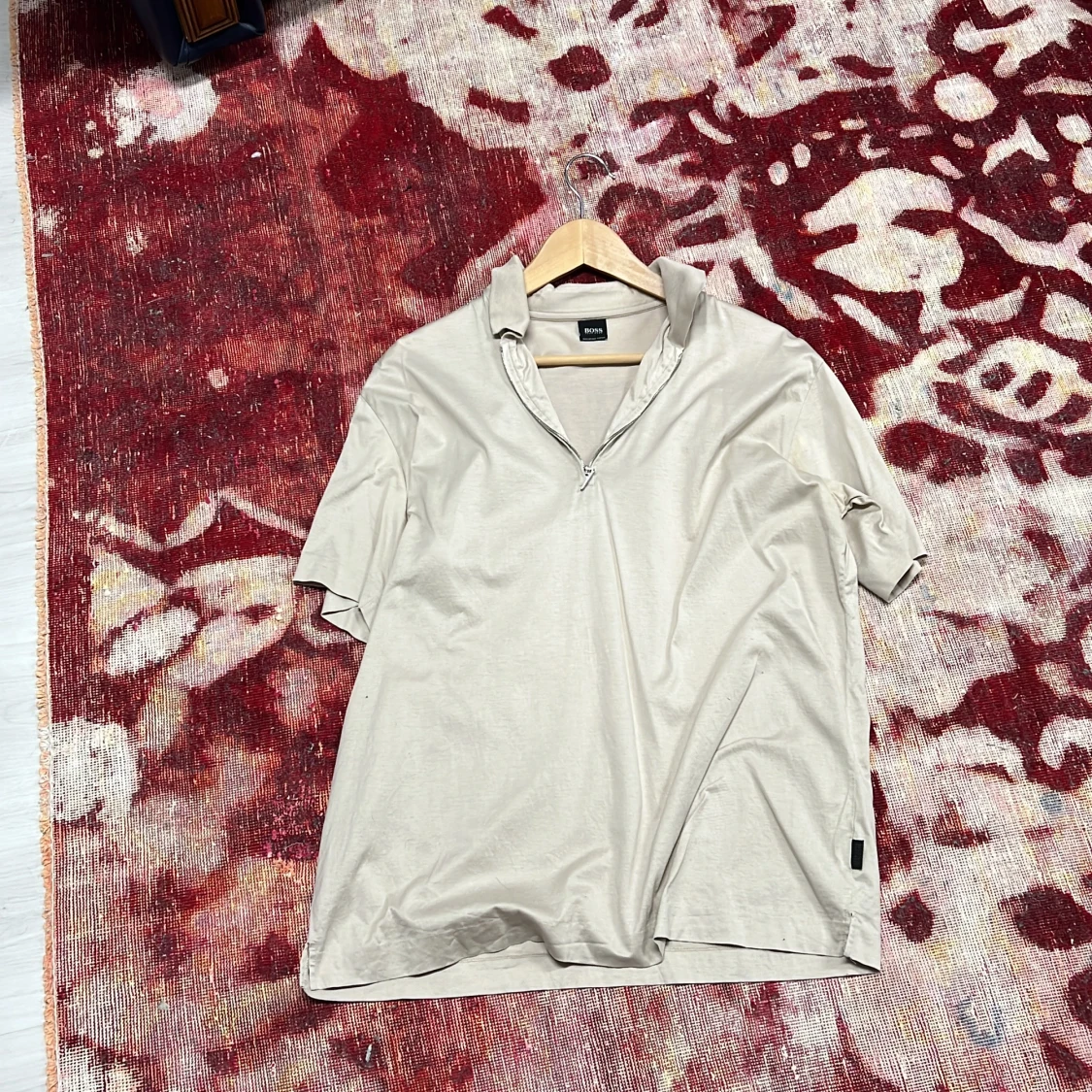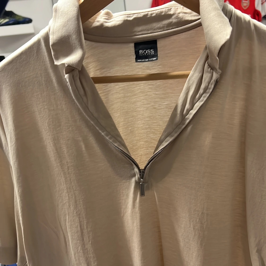 Snygg beige pikétröja från Hugo Boss i merceriserad bomull. Tröjan har korta ärmar, klassisk krage och en half zip-dragkedja framtill som ger en modern touch. Perfekt för dig som gillar stilrena och bekväma plagg med exklusiv känsla.