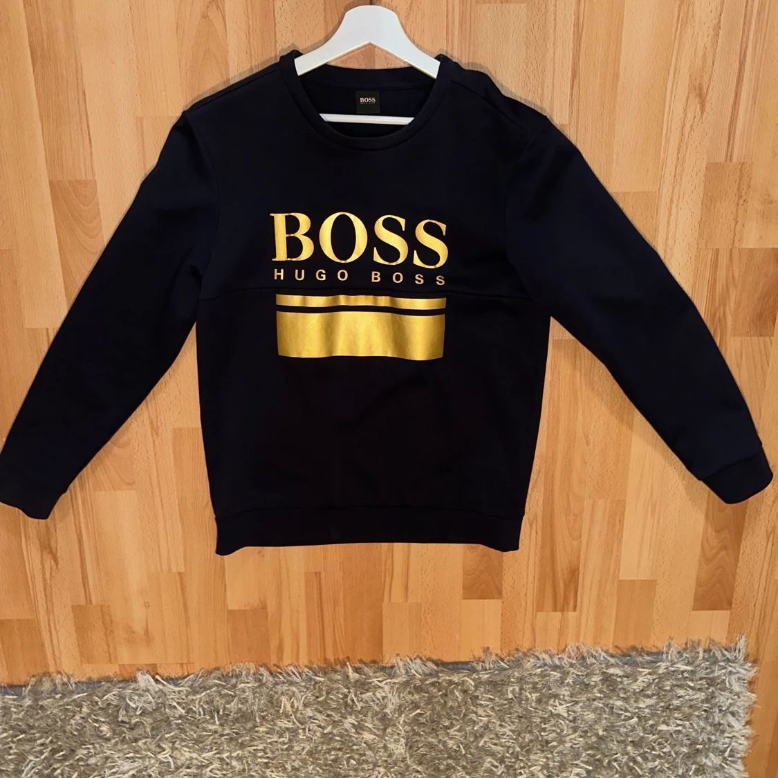 Säljer en svart tröja från Hugo Boss med guldfärgad logga på bröstet. Tröjan har långa ärmar och är perfekt för en stilren look. Passar bra till både jeans och chinos. Har hål där back men det syns ej köpt för 1800kr på room 1006 malmö