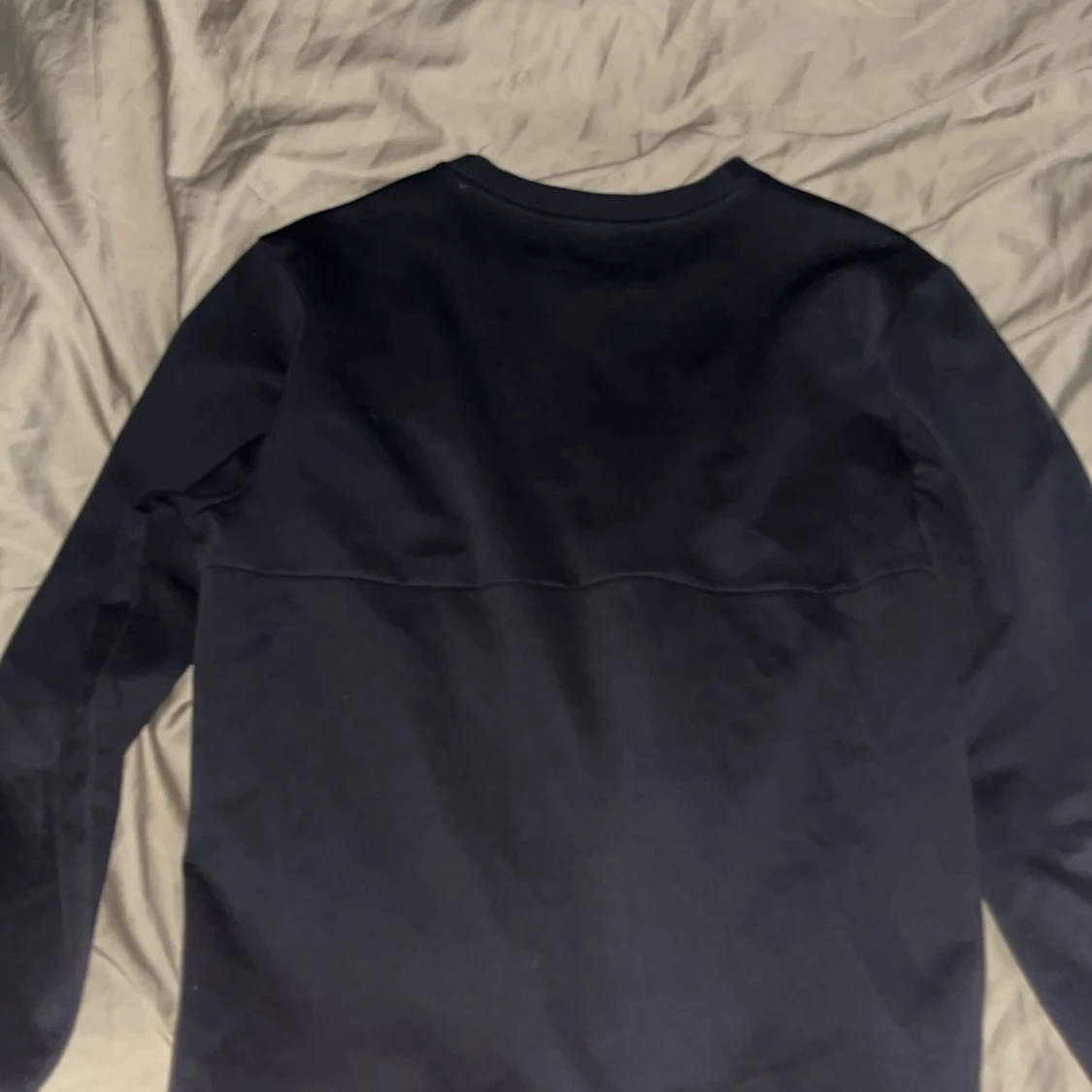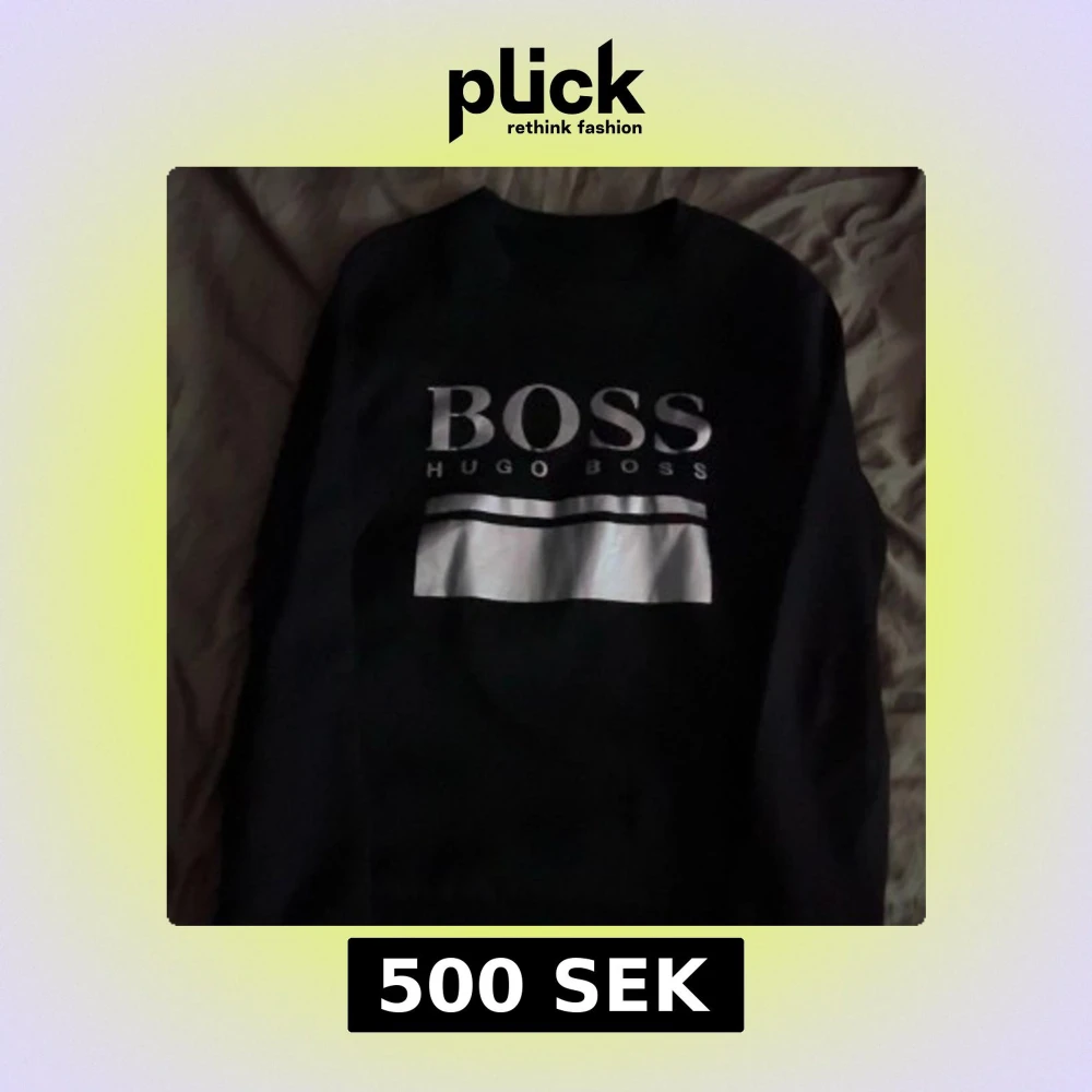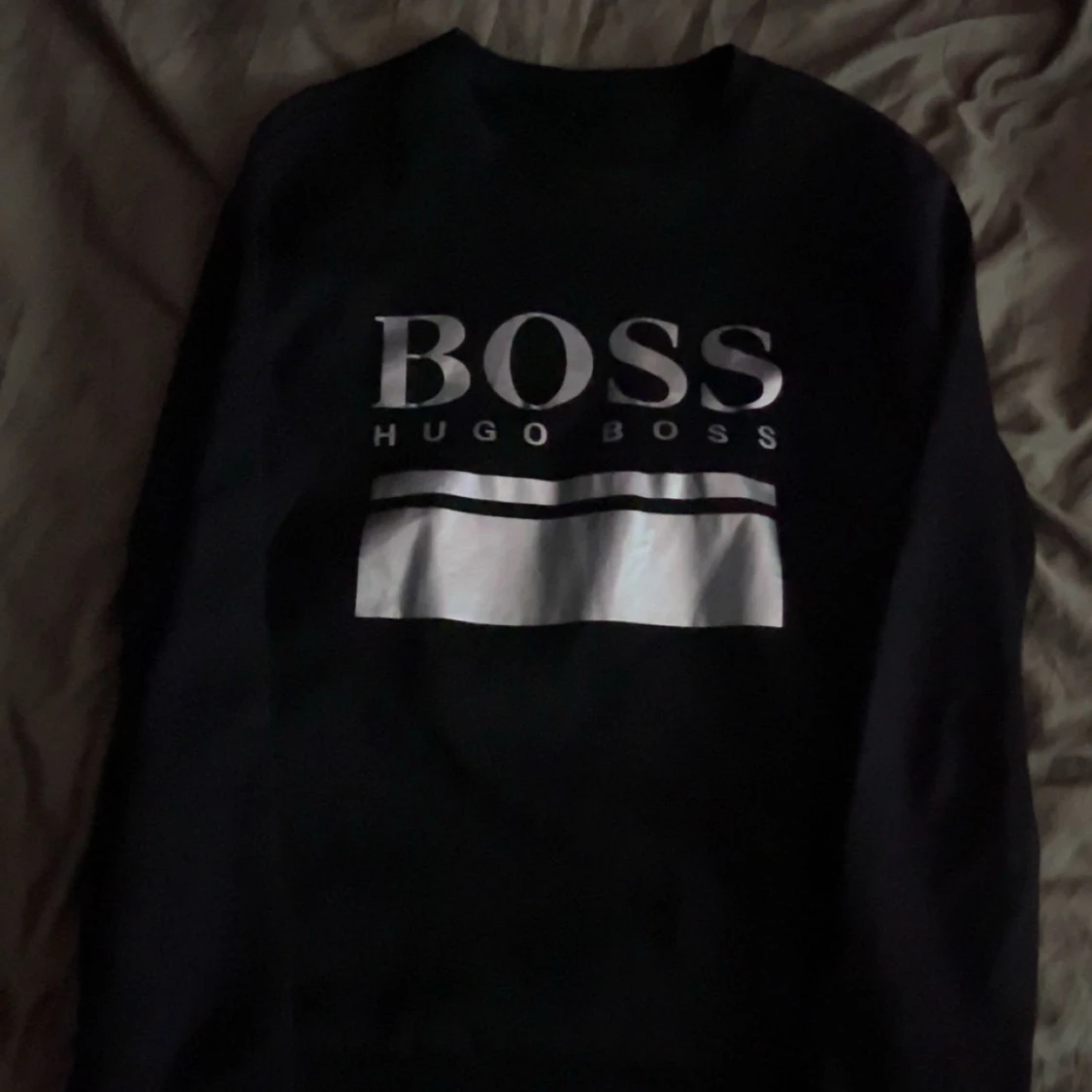 Säljer en svart sweatshirt från Hugo Boss med stor logga och text på bröstet i vitt och silver. Tröjan har rund halsringning och långa ärmar. Perfekt för en stilren och avslappnad look.