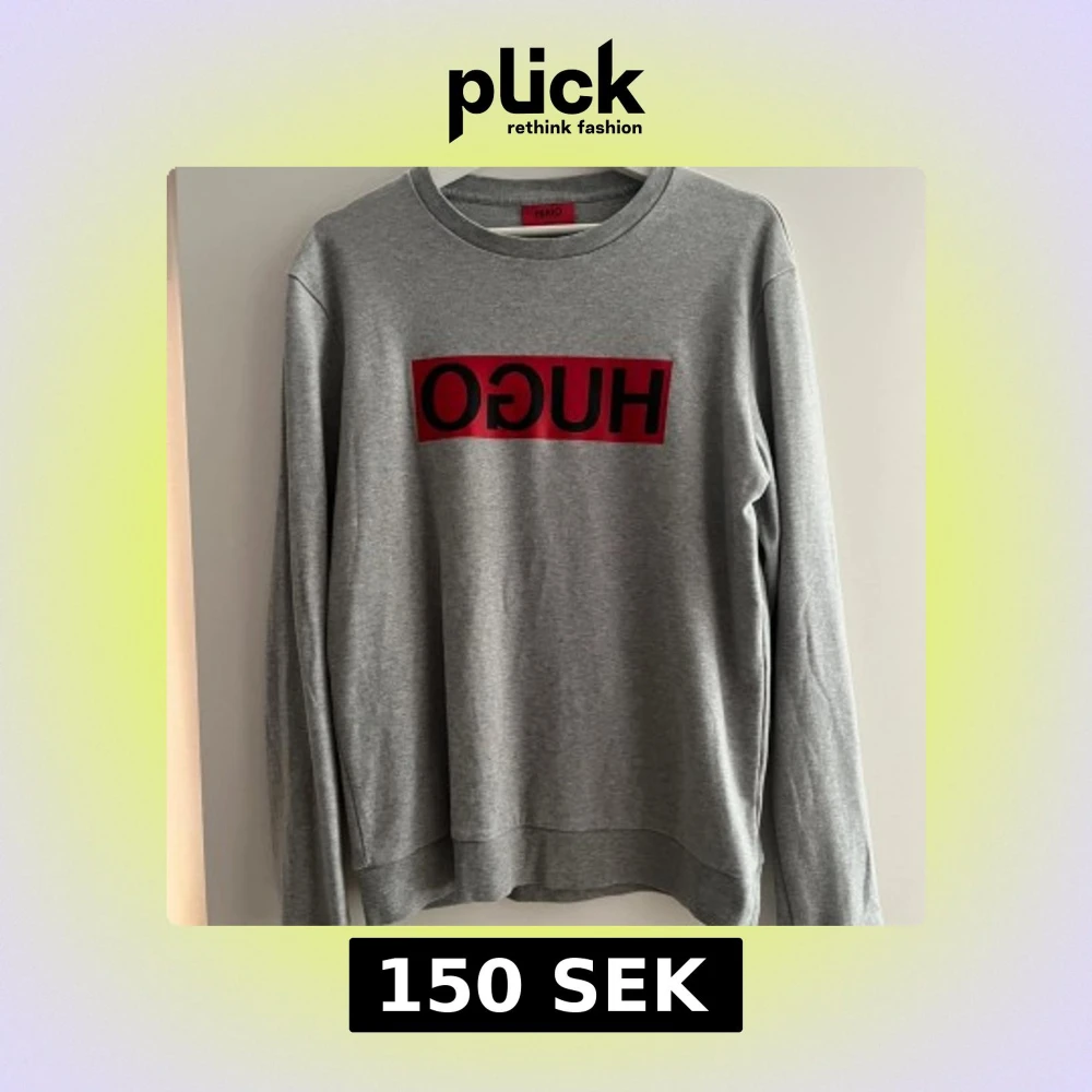 Säljer en grå sweatshirt från Hugo Boss med röd och svart logga tryckt på bröstet. Tröjan har rund halsringning och långa ärmar. Perfekt för en avslappnad och stilren look.