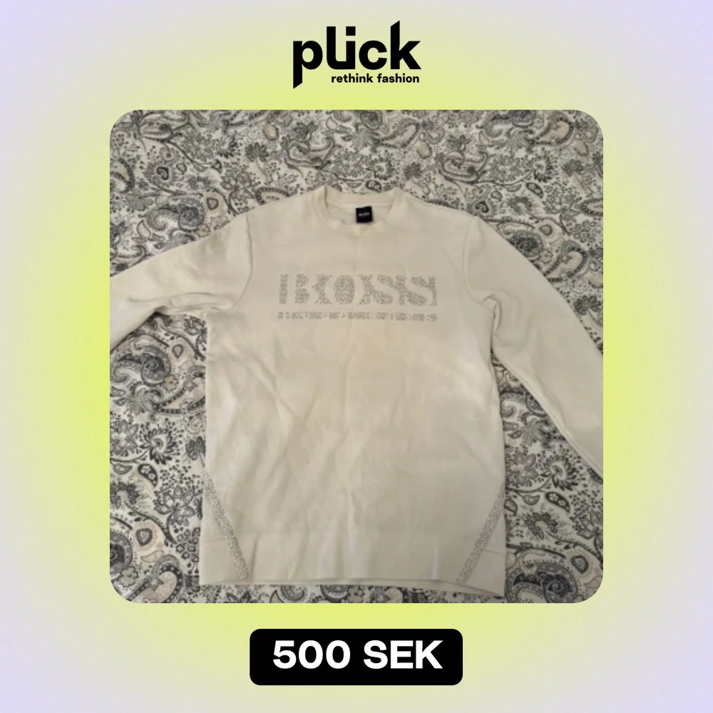 Säljer en stilren beige tröja från Hugo Boss i storlek M. Tröjan har ett diskret mönster framtill och är perfekt för både vardag och fest. Den är långärmad och gjord i ett mjukt material som känns skönt mot huden. Passar perfekt till höst- och vårgarderoben!