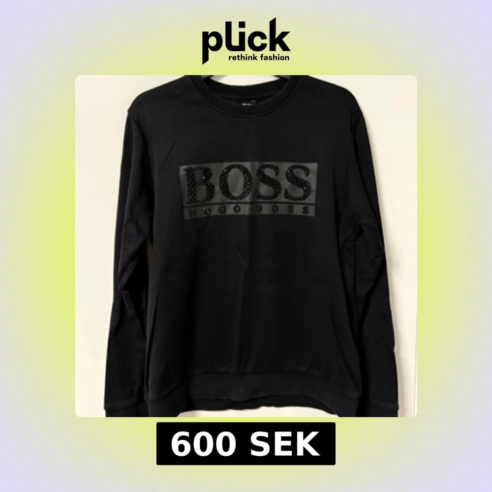 Svart sweatshirt från Hugo Boss med stort BOSS-tryck framtill i glansiga svarta paljetter. Tröjan har rund halsringning och långa ärmar. Perfekt för en stilren och trendig look. Dessutom endast använd 2 gånger!