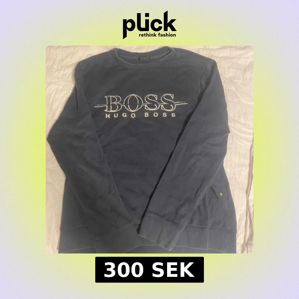 Säljer en stilren mörkblå tröja från Hugo Boss med deras ikoniska logga tryckt på framsidan. Tröjan har långa ärmar och en rund halsringning. Perfekt för en avslappnad och trendig look.