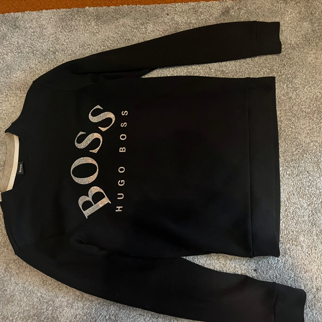Svart sweatshirt från Hugo Boss med stor silverfärgad logga framtill. Klassisk rund halsringning och långa ärmar. Perfekt för dig som gillar stilrena och trendiga plagg med tydlig branding.