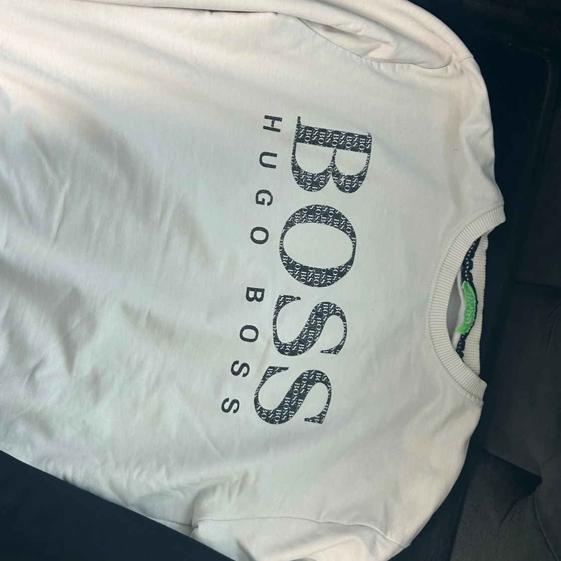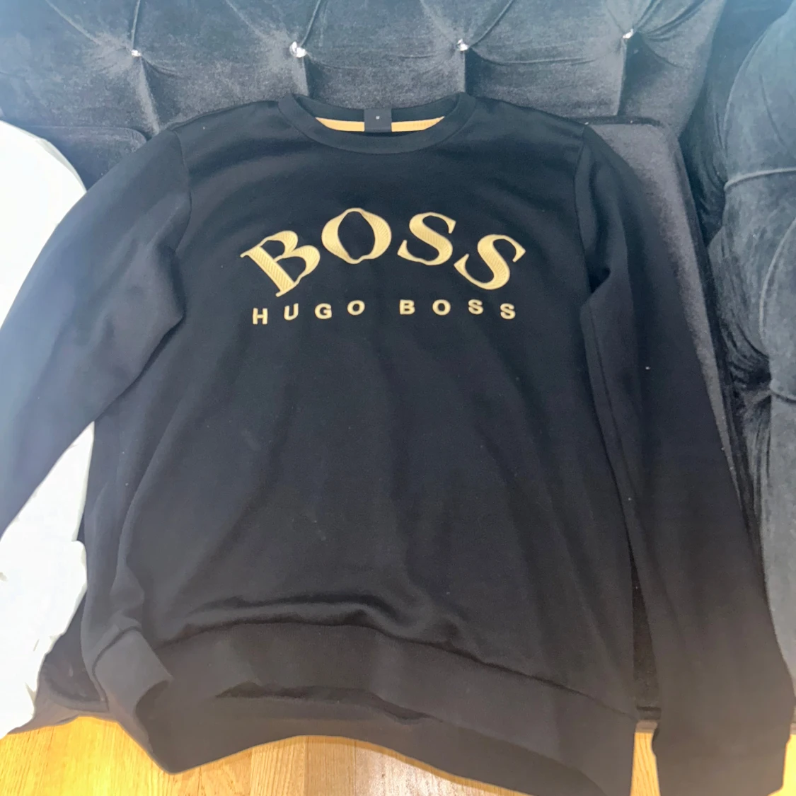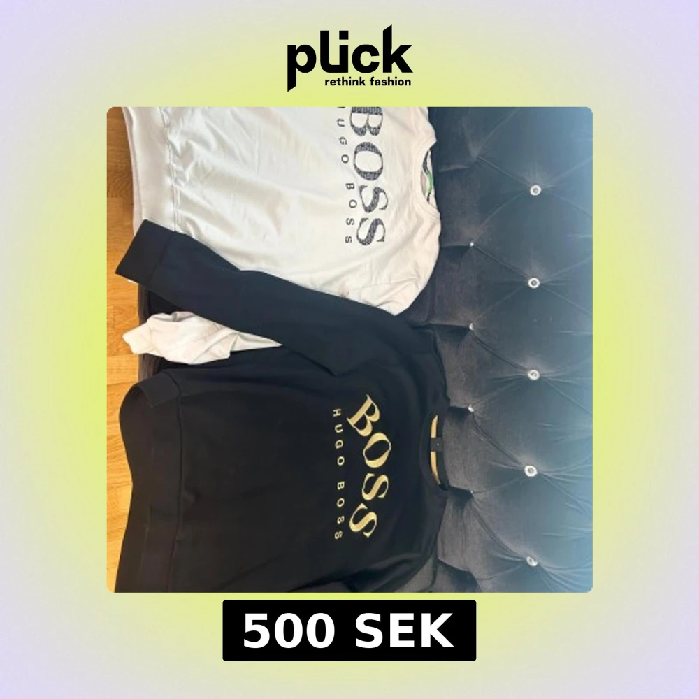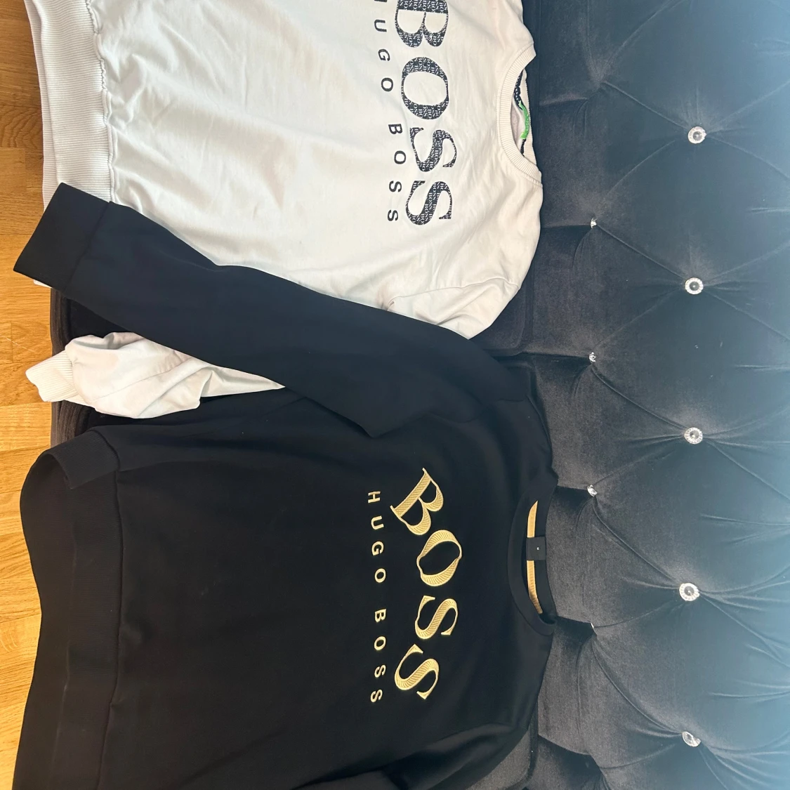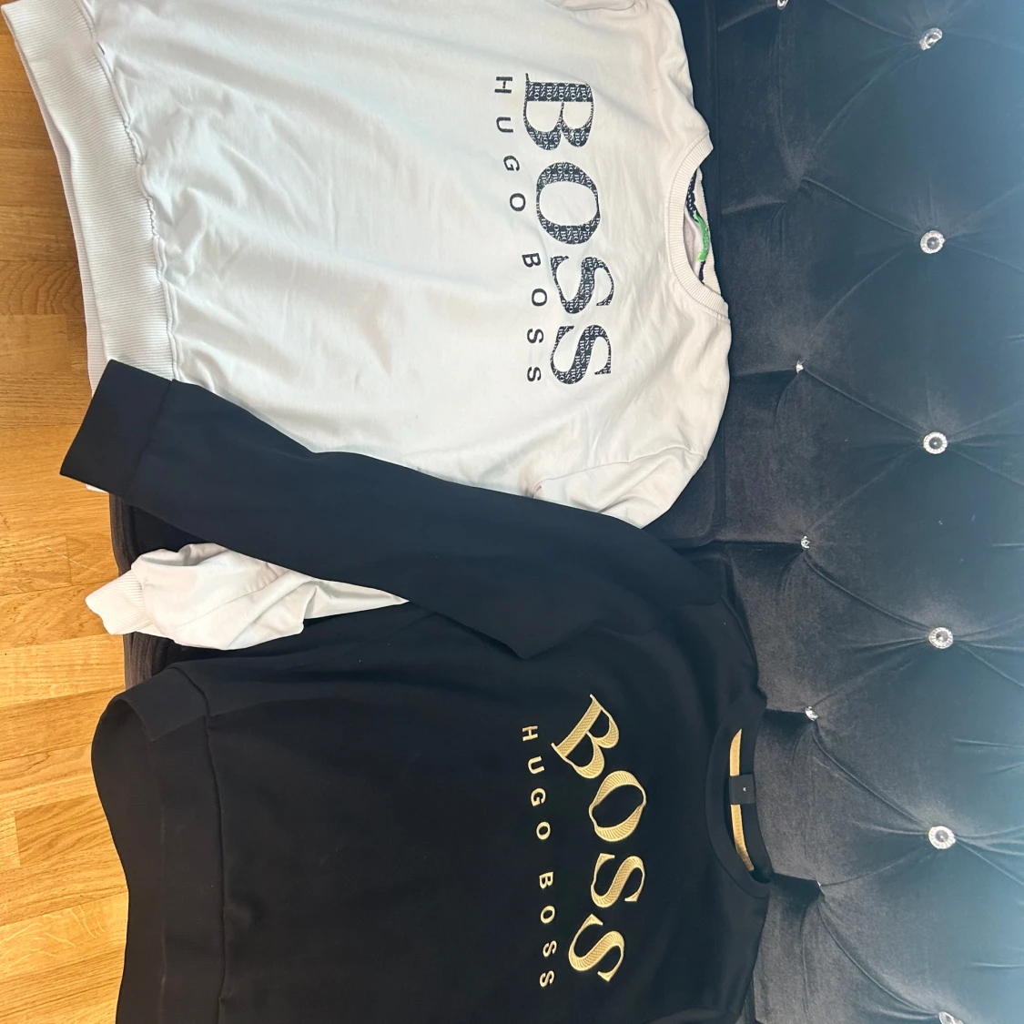 Två stilrena sweatshirts från Hugo Boss, en svart med guldig logga och en vit med svart logga. Båda har rund halsringning och lång ärm. Perfekta för en snygg och enkel look.