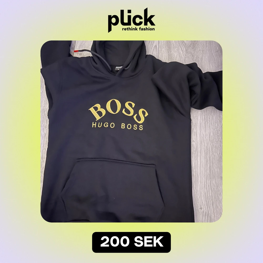 Säljer en snygg svart hoodie från Hugo Boss med deras logga i guld på bröstet. Använd 1 gång och är i nyskick säljer pga storleken. Storleken är M men passar även som S.