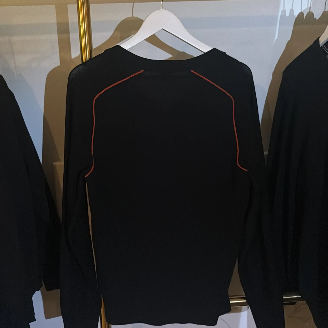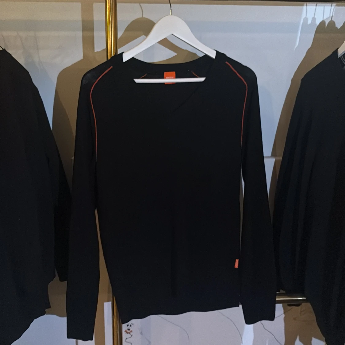 Svart långärmad tröja från Hugo Boss i 100% ull. Snygga röda detaljer längs axlarna ger en clean och modern look. Perfekt för dig som gillar stilrena plagg med en twist. Klassisk passform och rund halsringning.