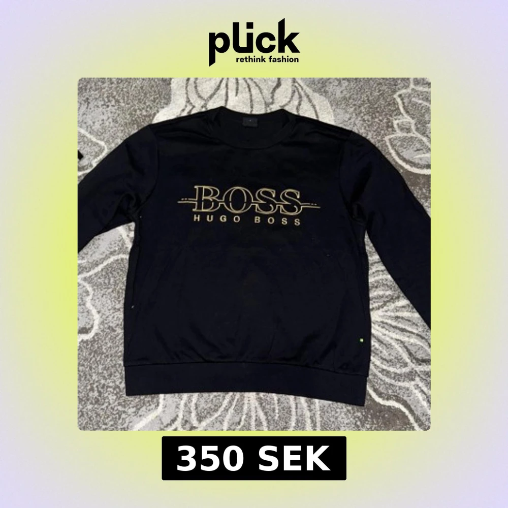 Säljer en stilren svart tröja från Hugo Boss med guldigt tryck på framsidan. Tröjan har en slim fit passform och långa ärmar. Perfekt för en snygg och avslappnad look.