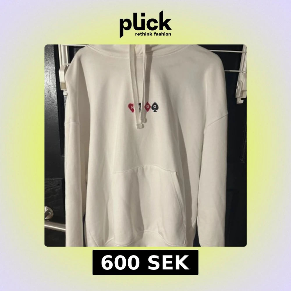 Säljer en stilren vit hoodie från Hugo med tryck av spelkort och texten 'Full House' på baksidan. Den har en känguruficka och justerbar huva med dragsko. Perfekt för en avslappnad stil.