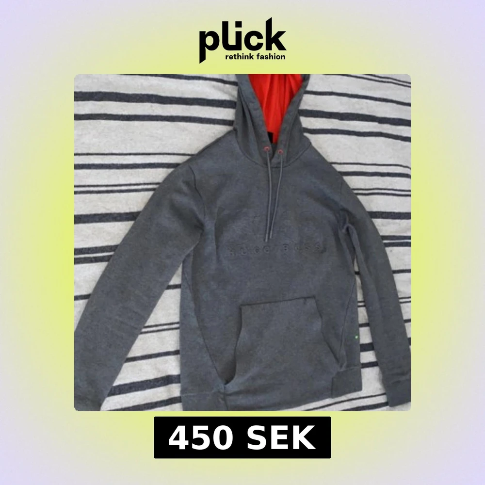 Säljer en stilren grå hoodie från Hugo Boss med broderad logga på bröstet. Insidan av huvan är röd för en snygg kontrast. Tröjan har känguruficka och dragsko i huvan. Perfekt för en chill och trendig look.