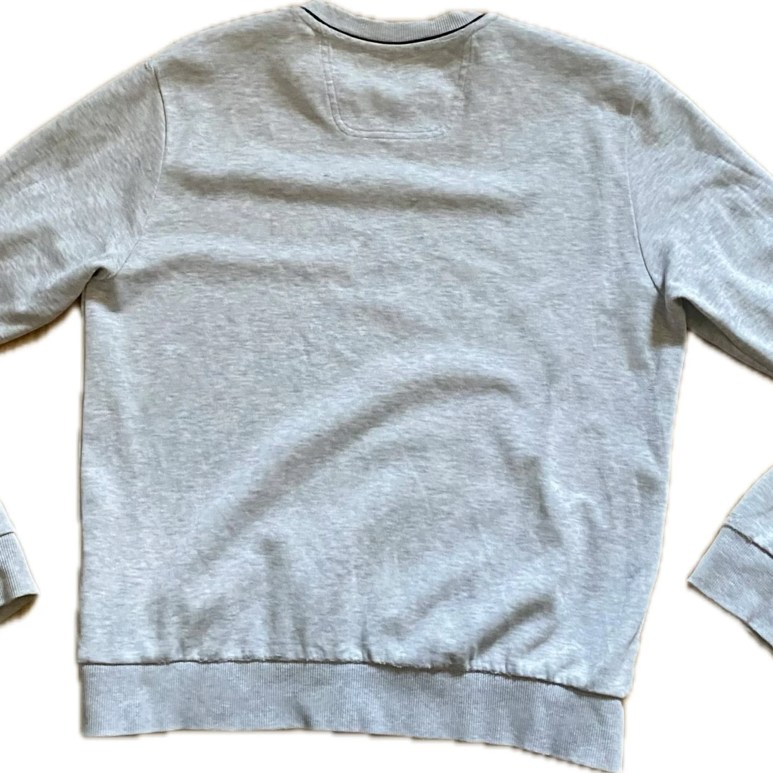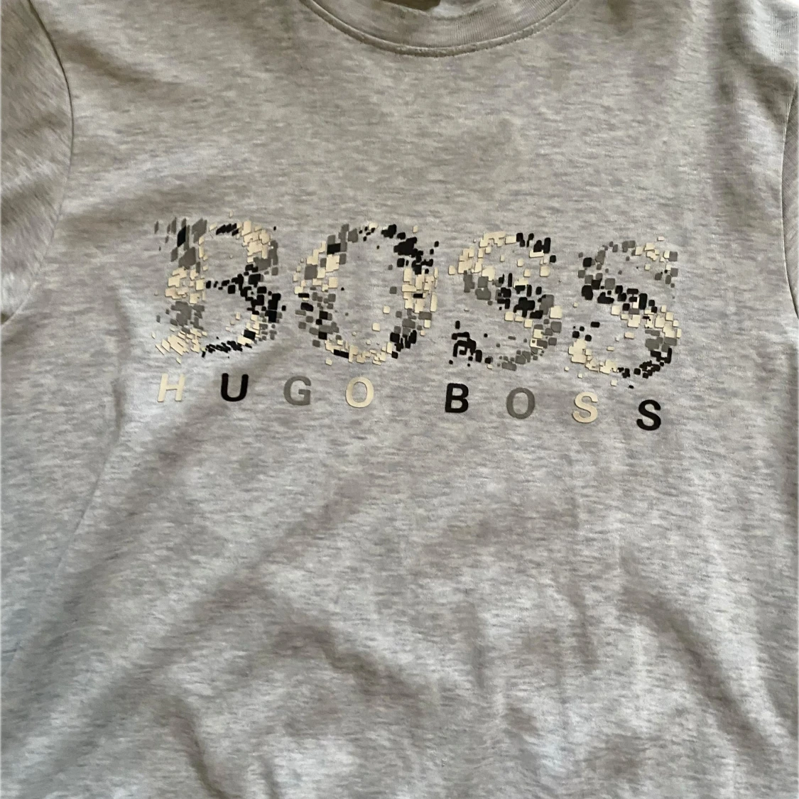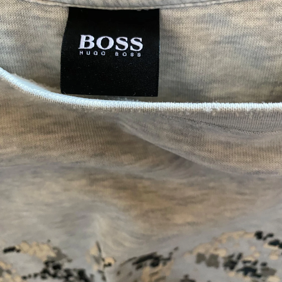 Snygg ljusgrå sweatshirt från Hugo Boss med stort BOSS-tryck i svart, vitt och svart på bröstet. Tröjan har rund hals, långa ärmar och ribbade muddar. Perfekt för en chill och stilren look.