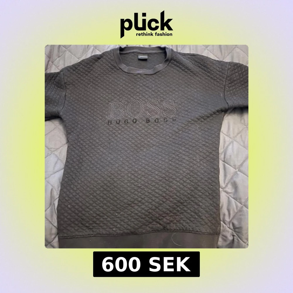 Säljer en stilren svart quiltad tröja från Hugo Boss med broderad logga på bröstet. Tröjan har en rund halsringning och är perfekt för en avslappnad men snygg look.