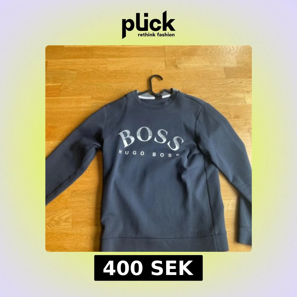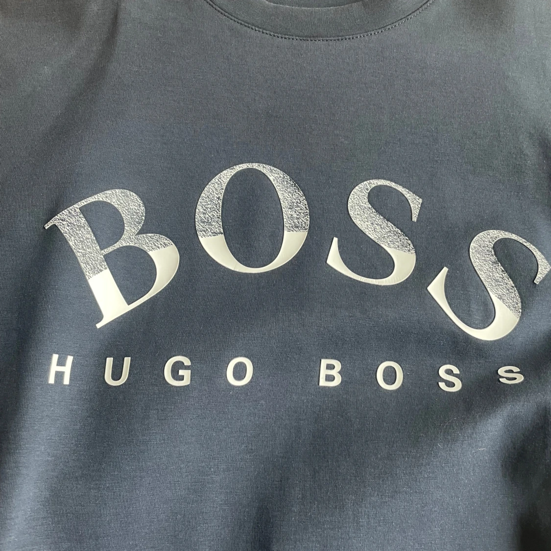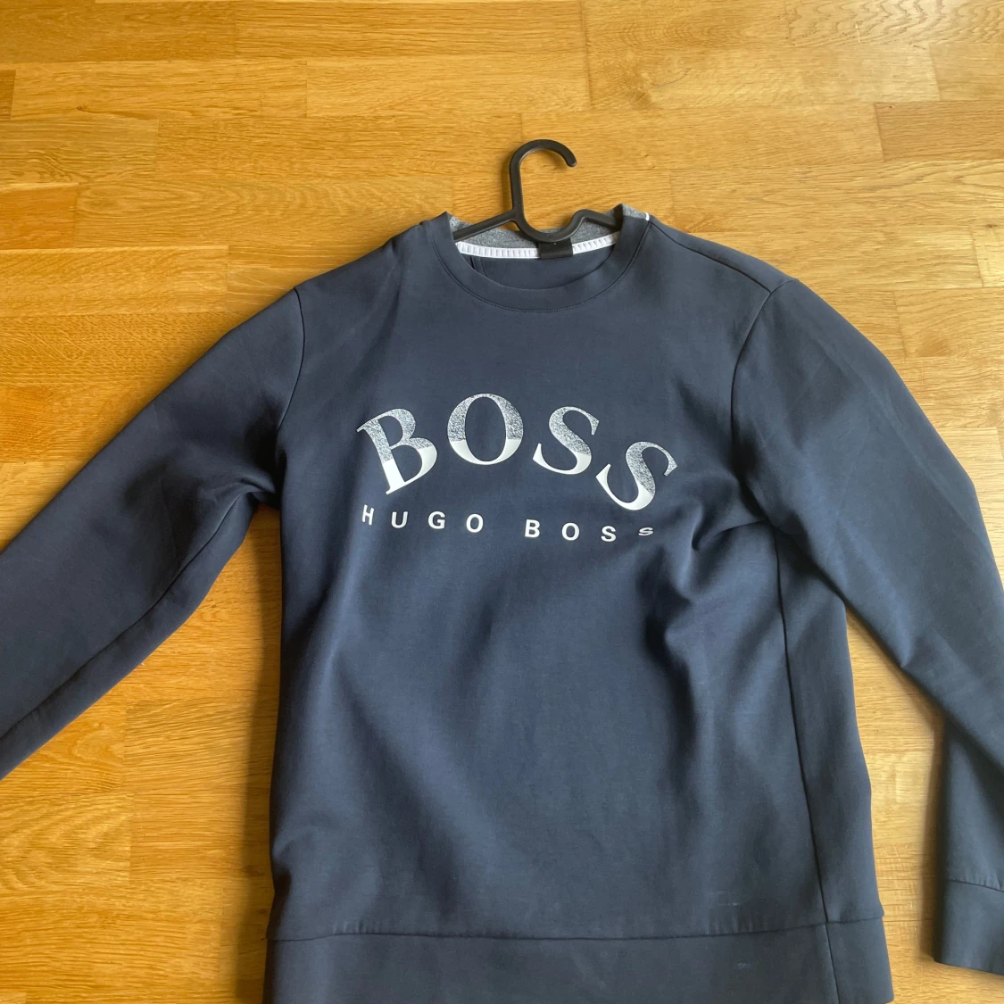 Snygg mörkblå sweatshirt från Hugo Boss med stort BOSS-tryck i vitt och silver på bröstet. Tröjan har rund hals, långa ärmar och är gjord i mjuk bomull. Perfekt för dig som gillar stilrena och klassiska märkesplagg.