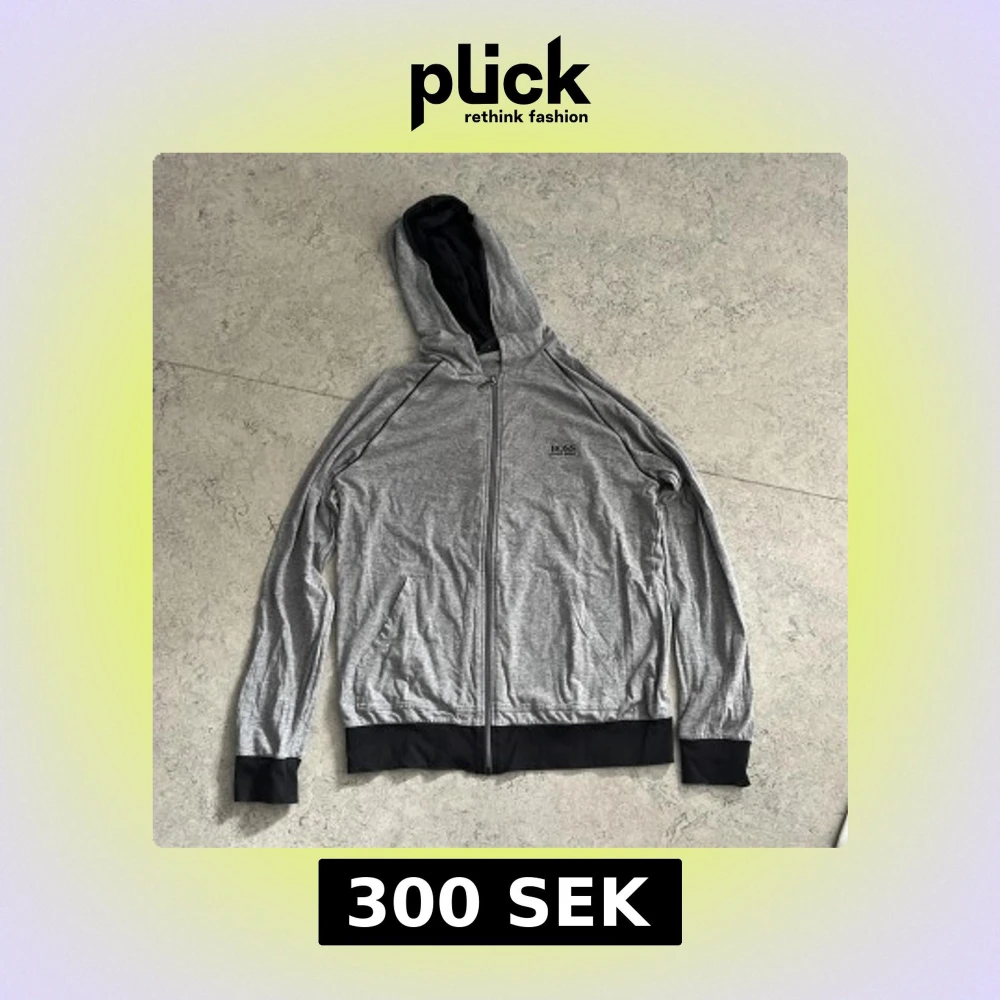 Snygg grå hoodie från Hugo Boss med svart foder i huvan och svarta muddar. Tröjan har hel dragkedja framtill, två fickor och diskret Boss-logga på bröstet.