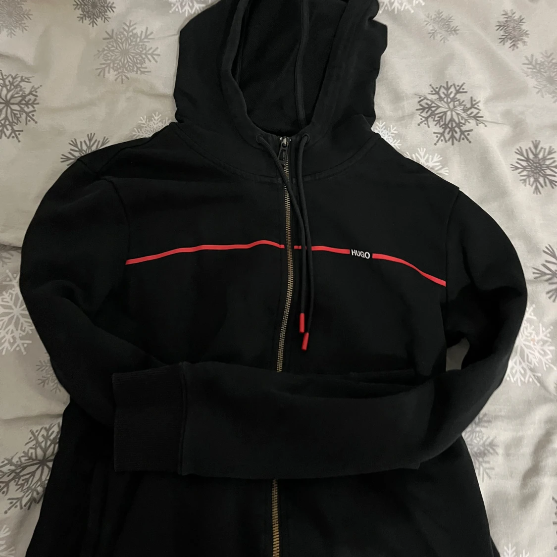 Snygg svart hoodie från Hugo med dragkedja och röd detalj över bröstet. Perfekt för en casual look med sin bekväma passform och huva. Ett stilrent val för alla tillfällen.
