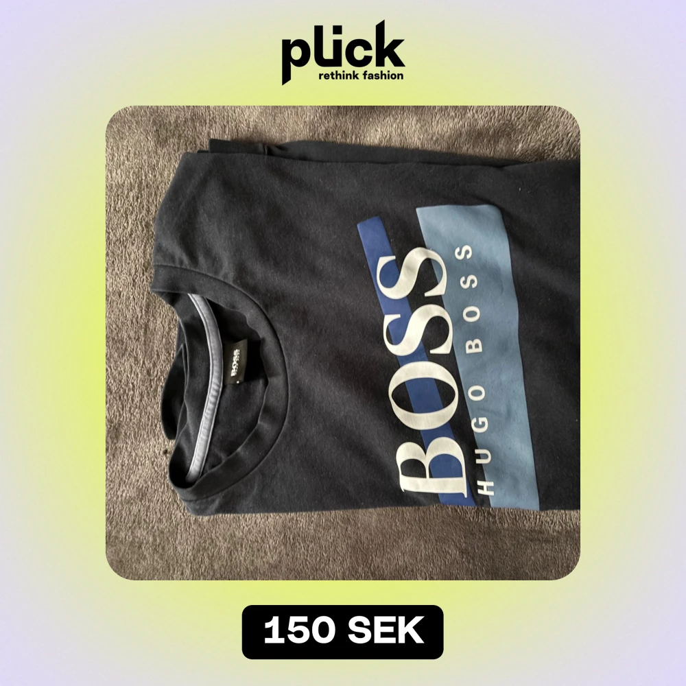 Säljer en snygg svart t-shirt från Hugo Boss med stort tryck i vitt och blått på framsidan. Perfekt för en casual look eller att ha under en jacka. T-shirten är i bra skick och passar till både vardag och fest.