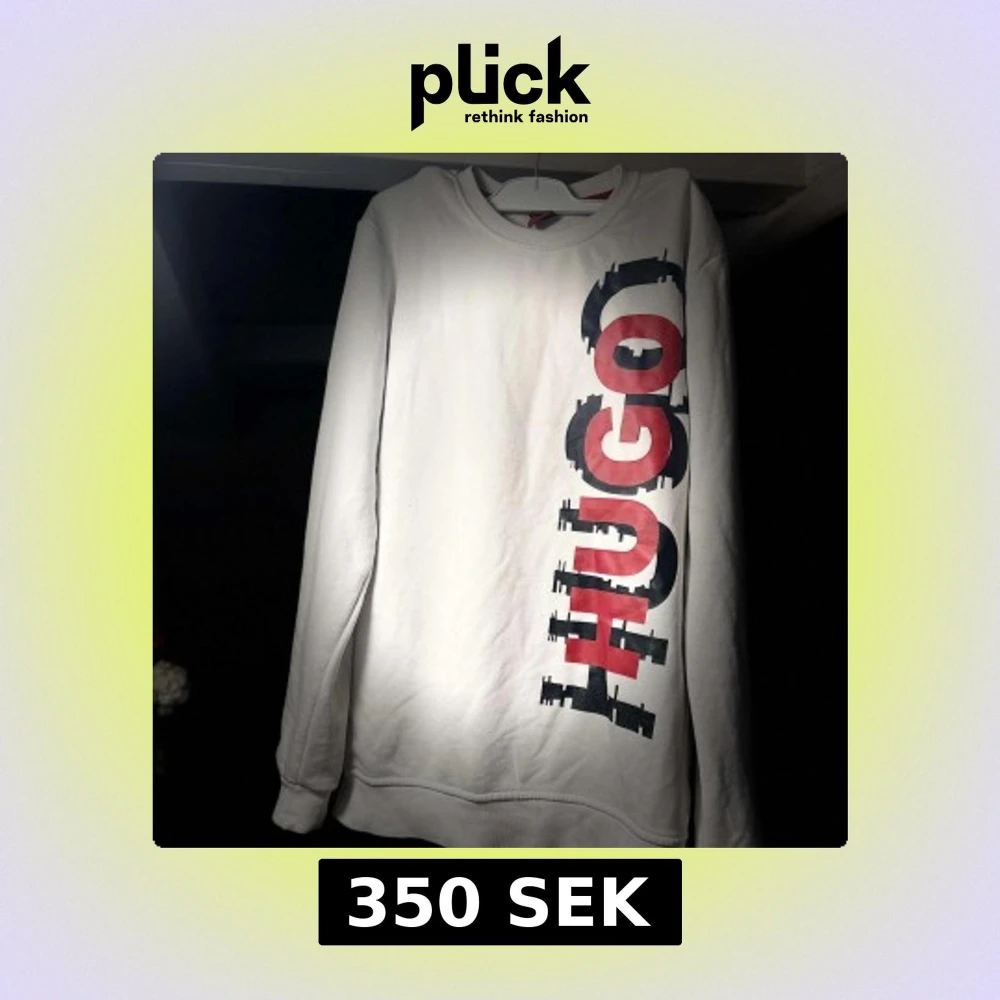 Säljer en stilren vit långärmad tröja från Hugo med ett stort tryck i rött och svart på framsidan. Perfekt för en avslappnad look. Tröjan har en rund halsringning och är tillverkad i ett mjukt material.
