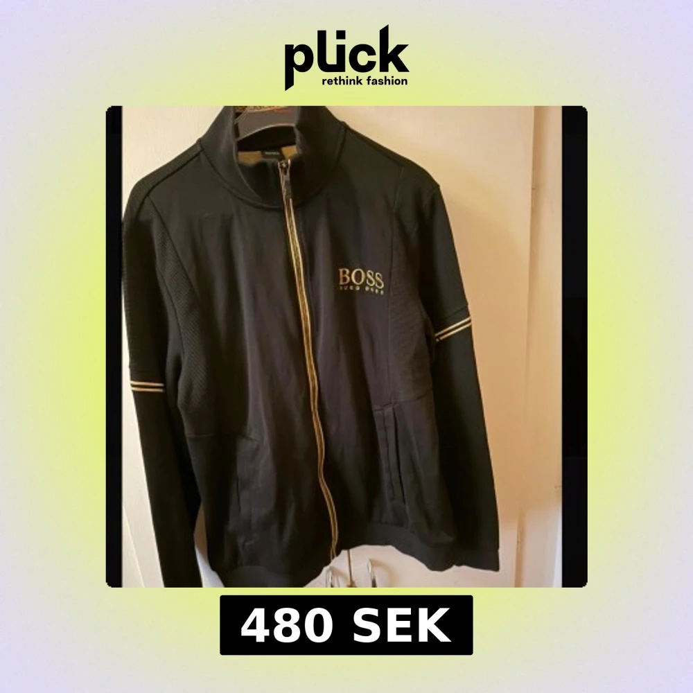 Svart zip tröja från Hugo Boss med gulddetaljer och dragkedja framtill. Tröjan har ribbade partier på axlar och ärmar samt diskreta ränder på ärmarna. Klassisk ståkrage och BOSS-logga på bröstet ger en clean och sportig vibe.