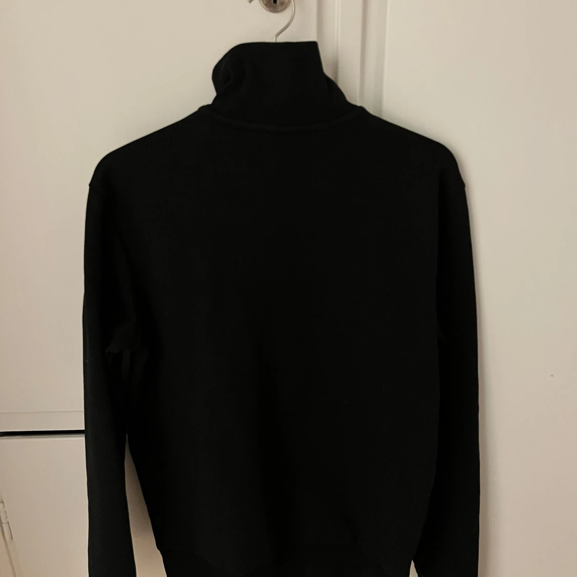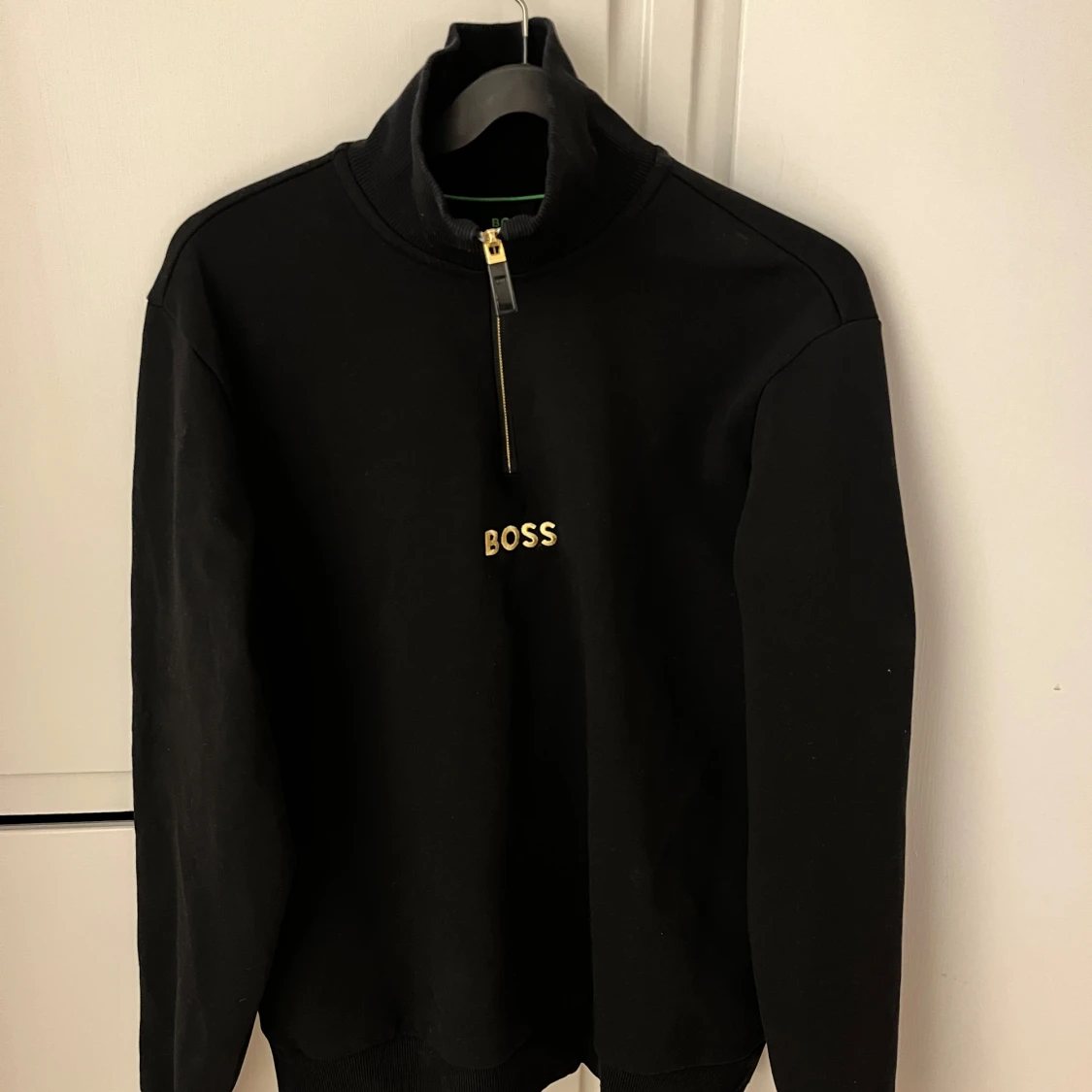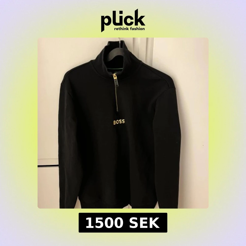 Säljer en stilren svart tröja från Hugo Boss med dragkedja och hög krage. Tröjan har långärmade ärmar och en broderad logga på bröstet. Perfekt för en avslappnad men ändå elegant look.