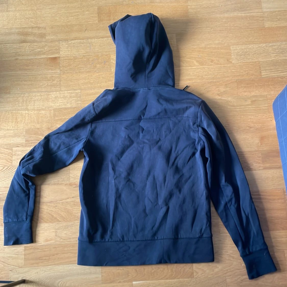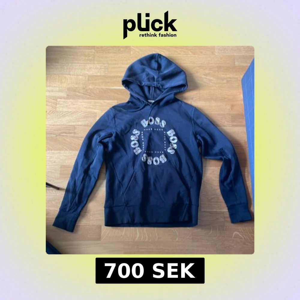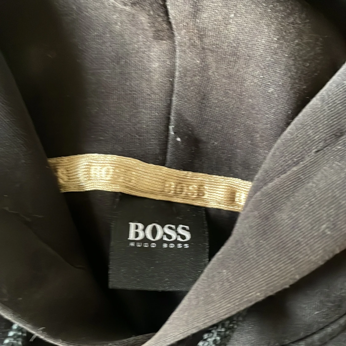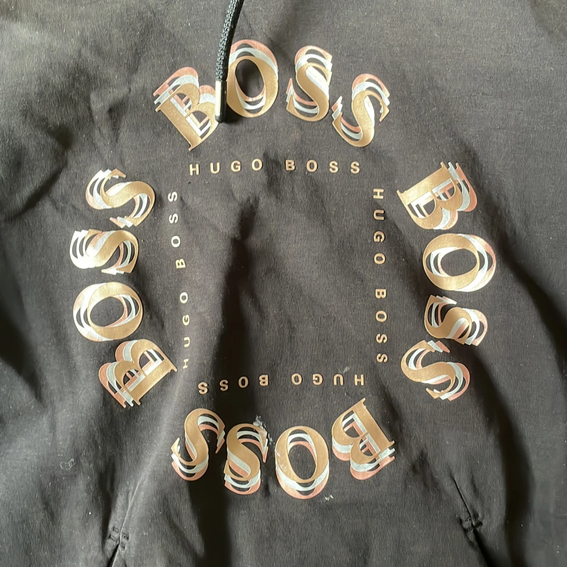 Snygg svart hoodie från Hugo Boss med stort BOSS-tryck i guld och vitt framtill. Tröjan har huva med dragsko, långa ärmar och en klassisk känguruficka. Perfekt för en chill och stilren look. Den har lite färg på sig och är lite sol bränd storlek xs män passar s, pris kan diskuteras