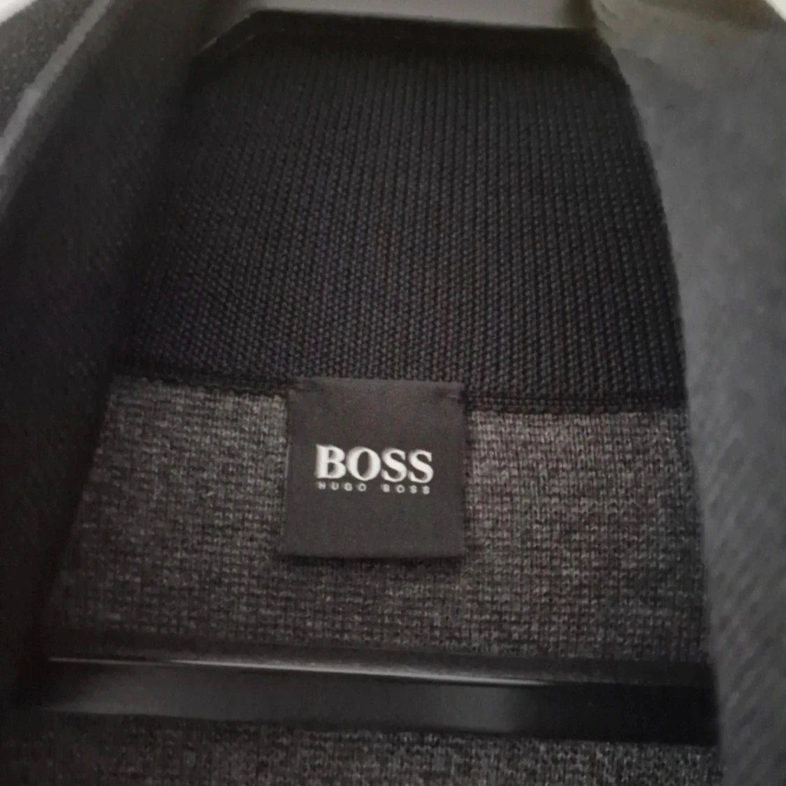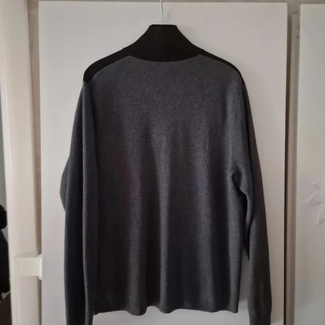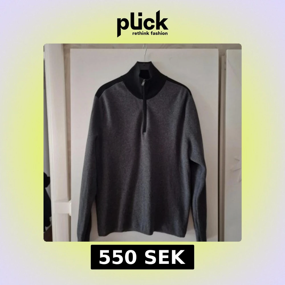 Snygg grå långärmad tröja från Hugo Boss med svarta axelpartier och hög krage med half zip-dragkedja. Tillverkad i en mjuk ullmix som känns lyxig och passar perfekt till lager-på-lager. Enkel och stilren design som funkar till många outfits. Oanvänd men tvättad en gång.