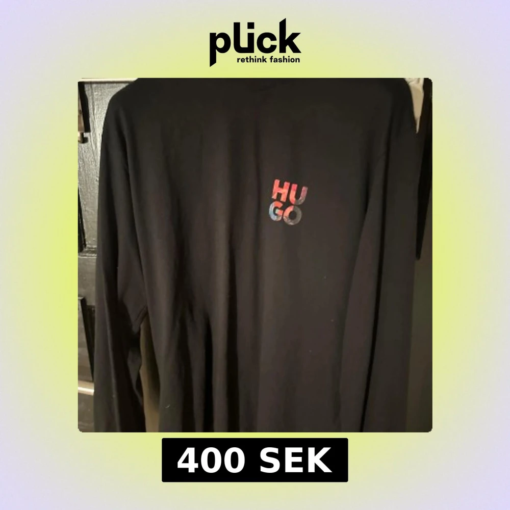 Säljer en svart långärmad tröja från Hugo med färgglad logotyp på bröstet och ett coolt tryck på ryggen. Perfekt för en stilren och modern look.