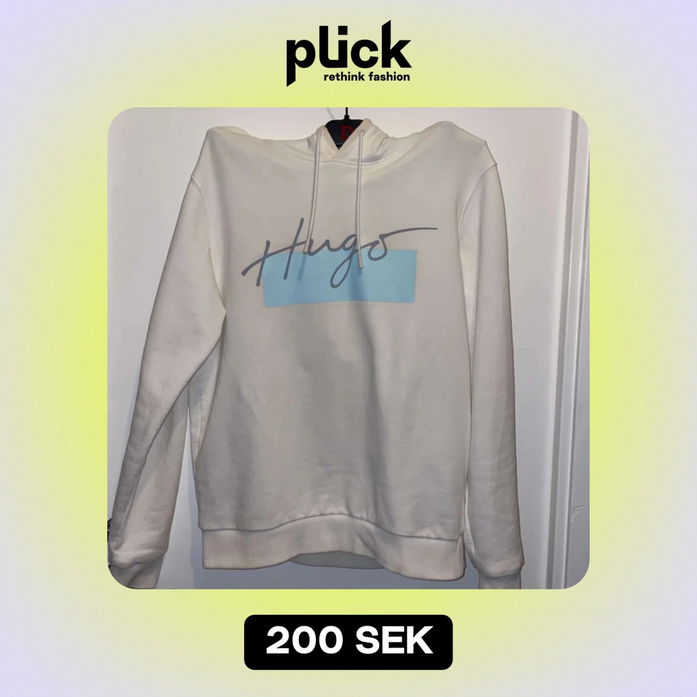 Säljer en stilren vit hoodie från Hugo med ett coolt blått tryck på framsidan. Den har en klassisk passform med långa ärmar och en bekväm huva. Hör av dig om du är intresserad!