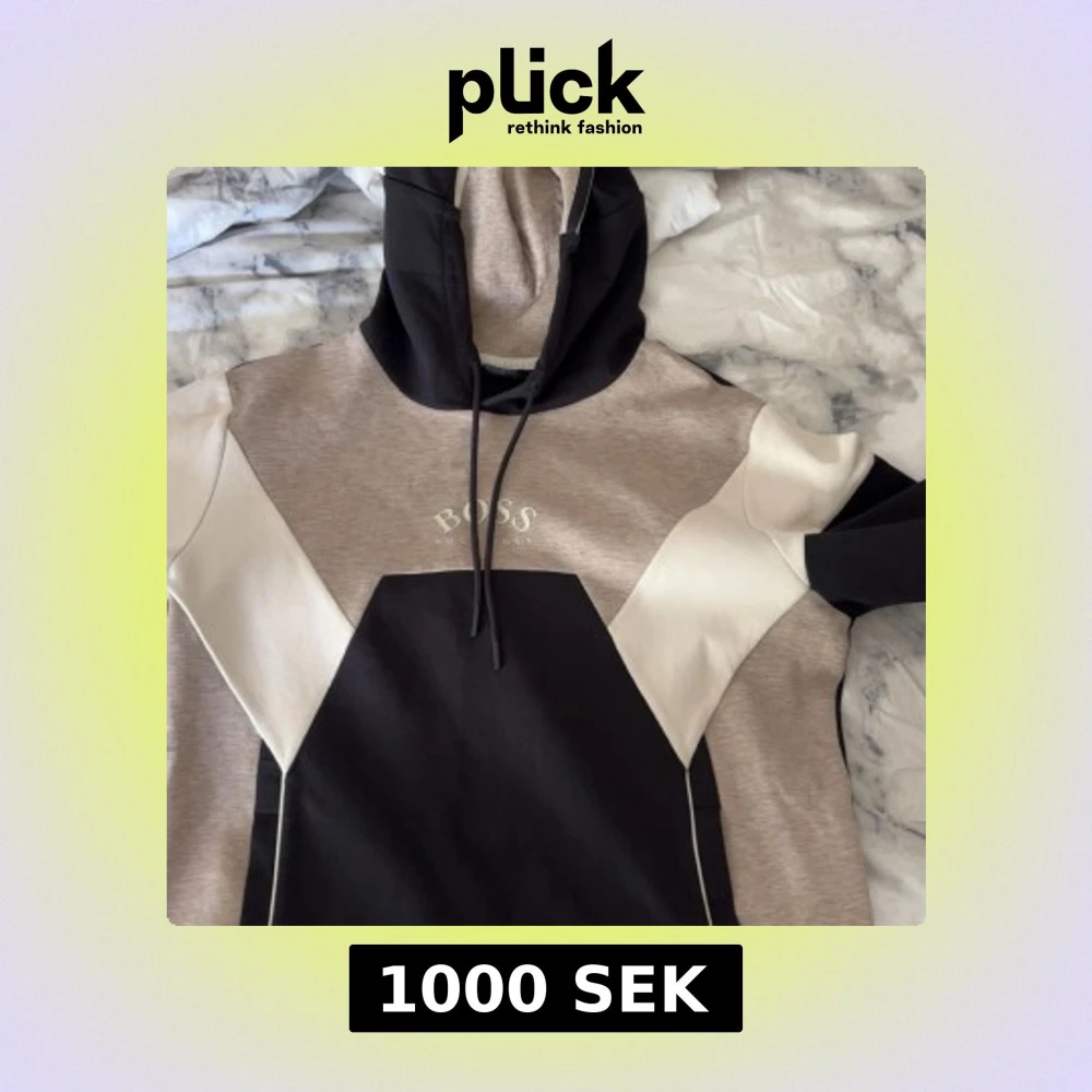 Säljer en snygg beige och svart hoodie från Hugo Boss med vita detaljer. Hoodien har en klassisk design med justerbar huva och logotyp framtill. Perfekt för en stilren och bekväm look.