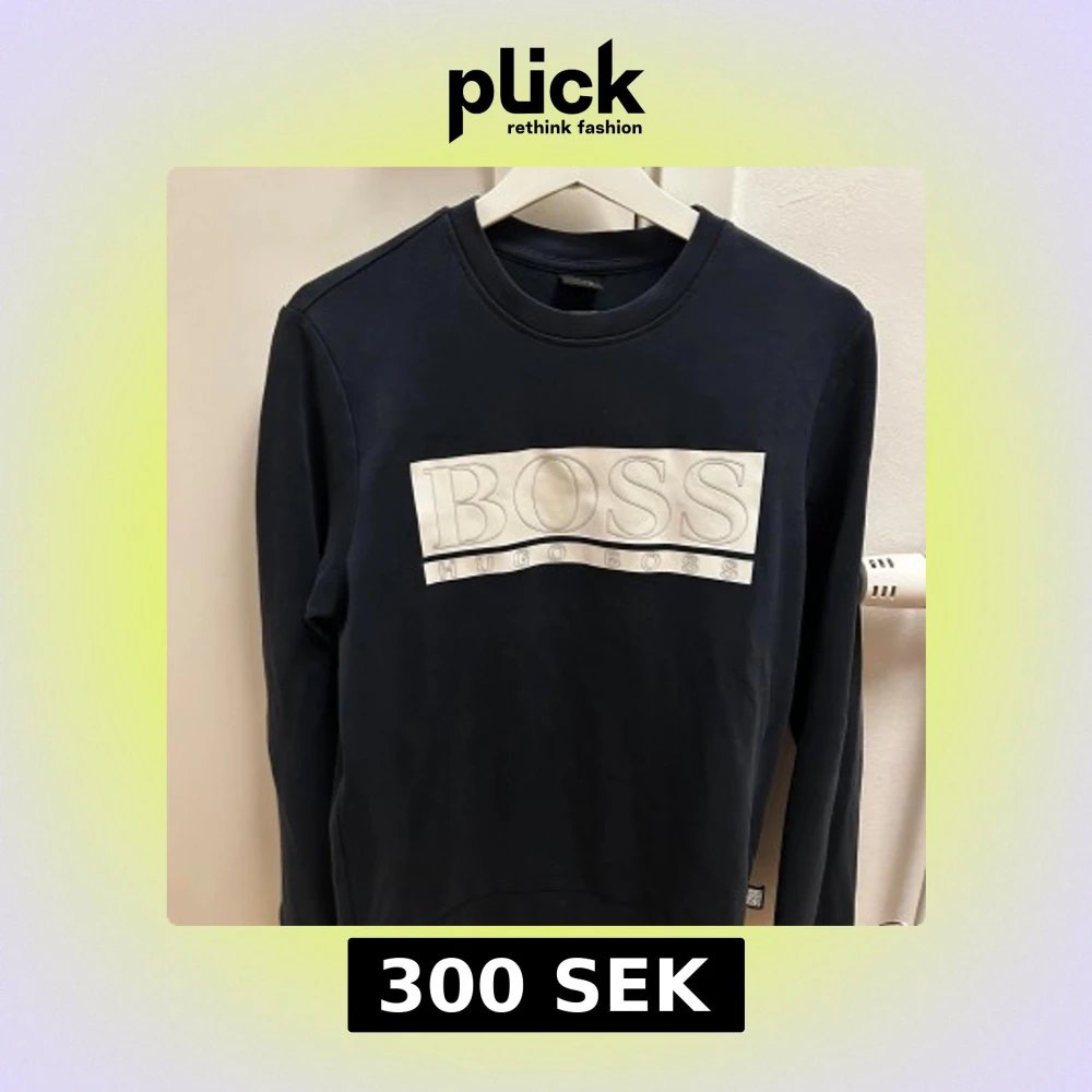Mörkblå långärmad tröja från Hugo Boss med stor vit logotyp på bröstet. Rund hals och mjukt material, perfekt för en clean och stilren look. Passar dig som gillar klassiska märken och enkel design.
