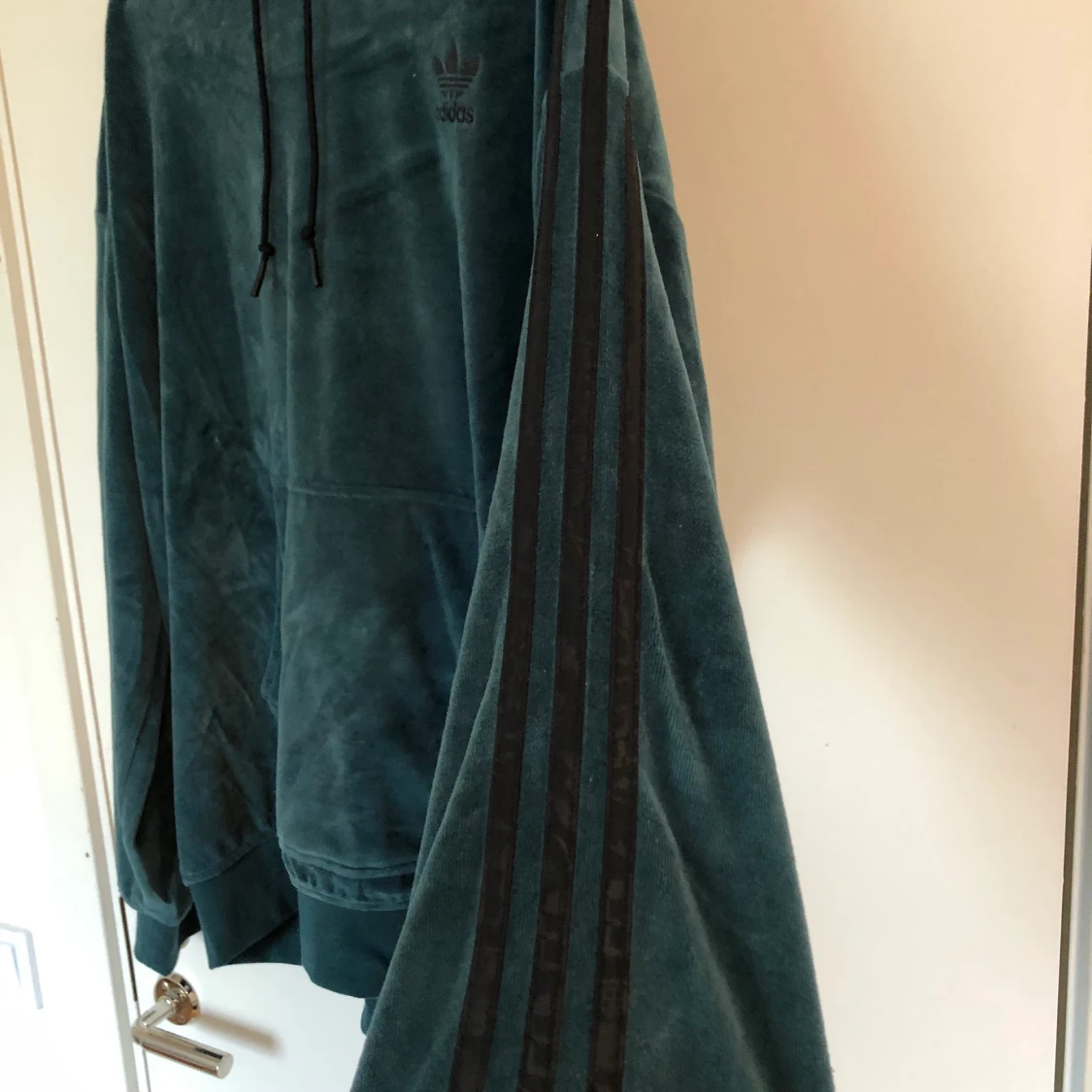grönblå (smaragd) adidas velvet/sammet luvtröja i storlek m/l. använd en gång så i nyskick. den är lite grönare irl än på bild. passar s-l enkelt. så skön och mysig, perfekt snyggare tjocktröja🤩🥰 ansvarar inte för postens slarv