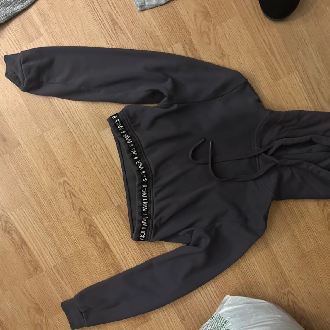 Säljer en mörkgrå croppad hoodie från ICIW med långa ärmar och huva. Tröjan har svarta detaljer med ICIW-logga längs nederkanten och ärmarna. Perfekt för en sportig och avslappnad stil.