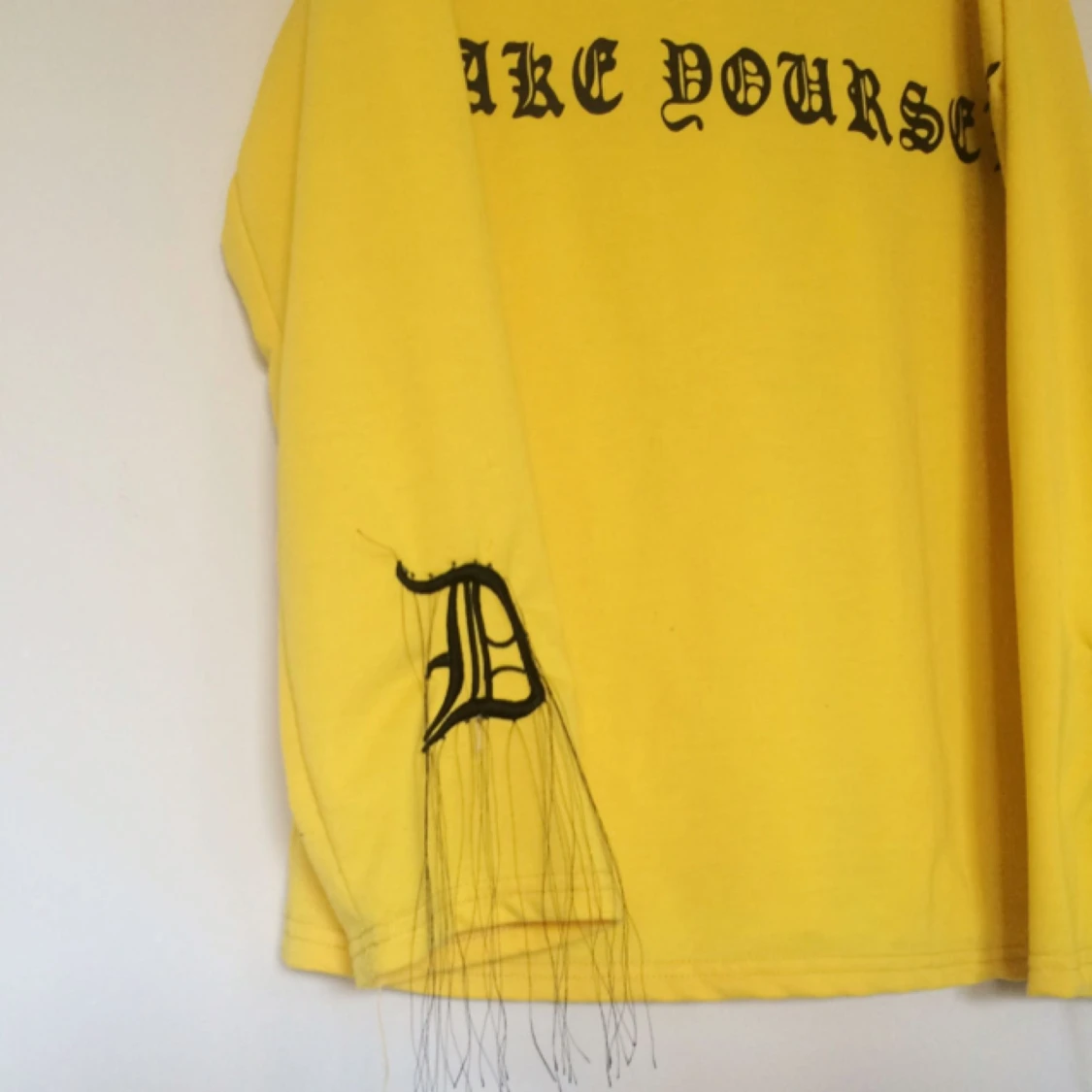 Gul tröja med svart text på ryggen och detaljer på ärmarna. Jag är 178cm lång och brukar använda den som "klänning" med ett par shorts under.