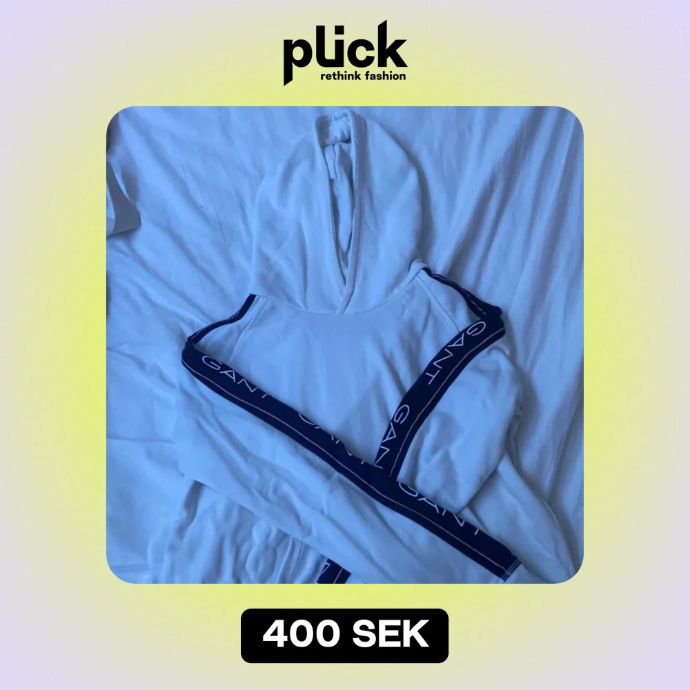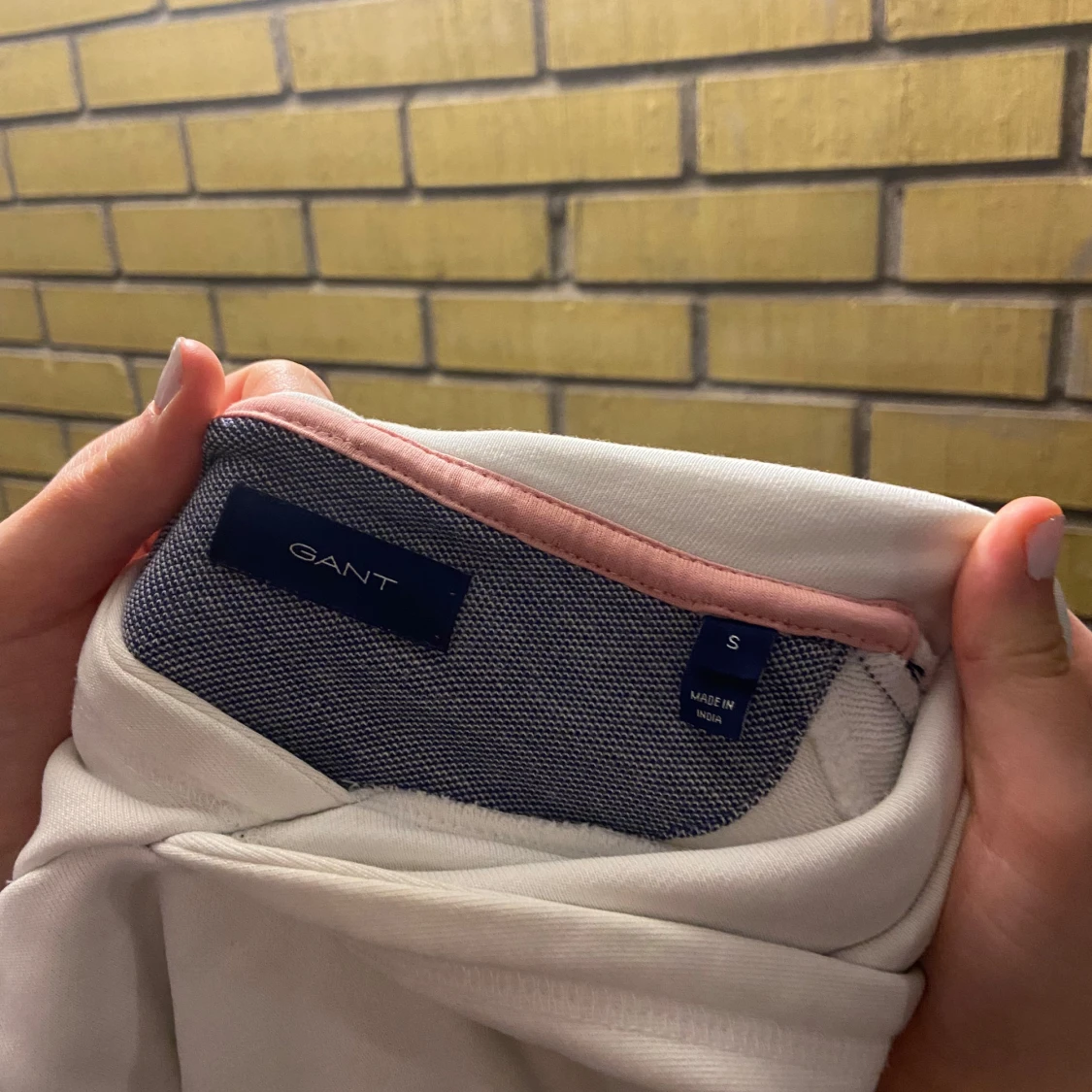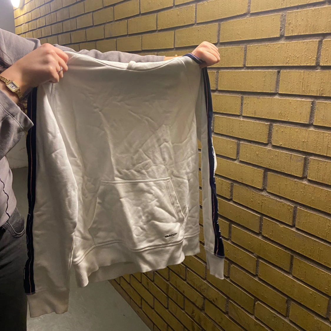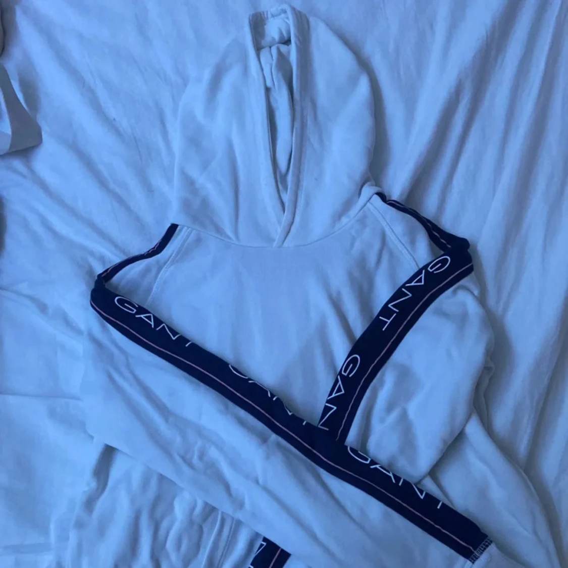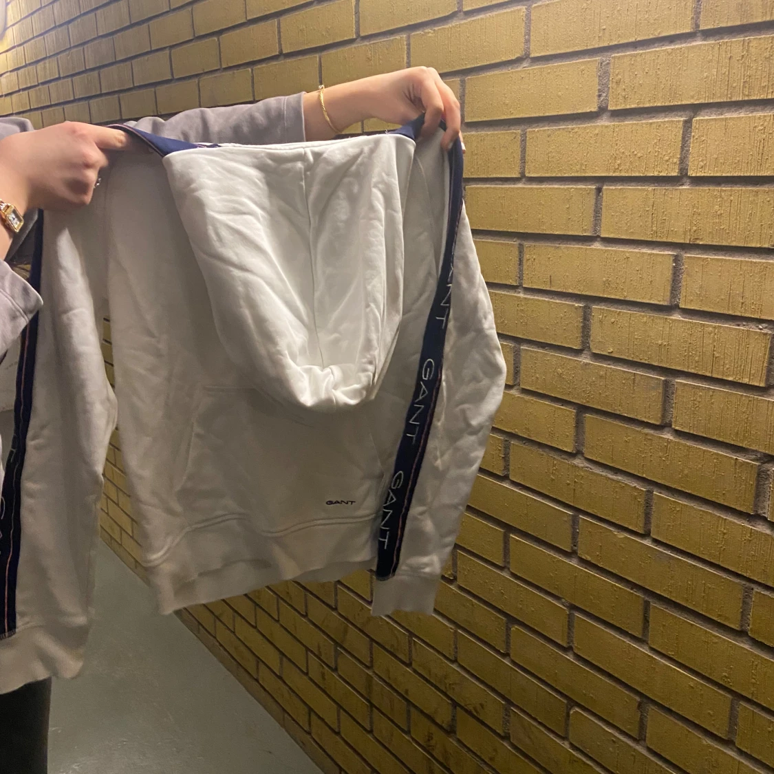 Säljer en snygg vit hoodie från GANT i storlek S. Den har en klassisk design med mörkblå detaljer längs ärmarna och en stor ficka framtill. Huvan är mjuk och bekväm, perfekt för kyliga dagar. Hör av dig vid intresse!💕