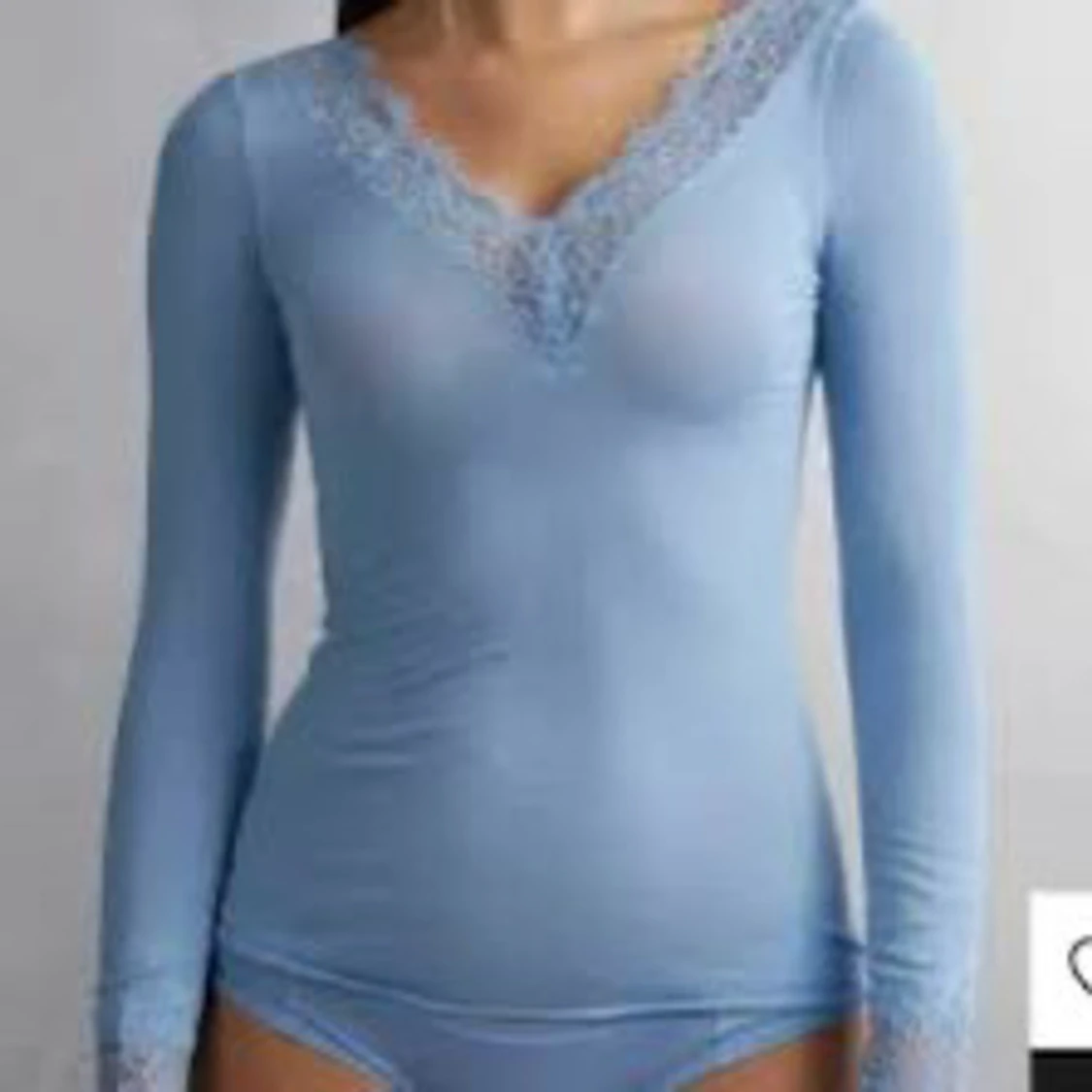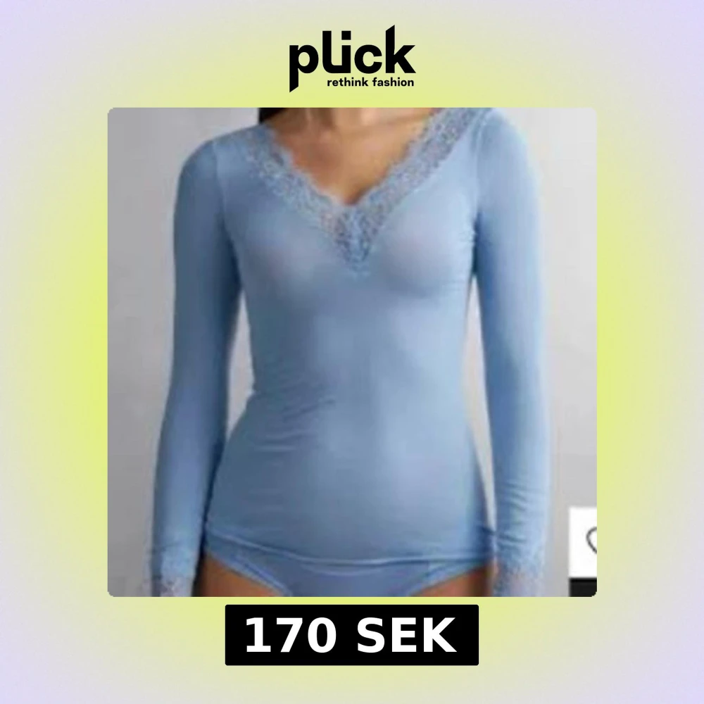 Supersöt ljusblå långärmad topp med v-ringning och fina spetsdetaljer vid halsringningen och ärmsluten. Sitter tight och är perfekt att styla med jeans eller kjol för en fräsch look. Strl: S köpte ny för 489kr så säljer inte för under 200kr!!🥰🙏🏼💗