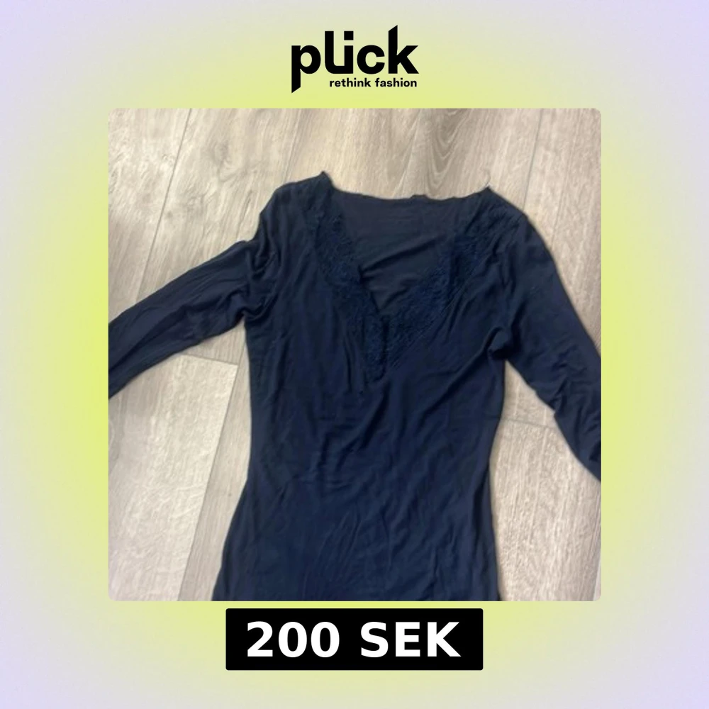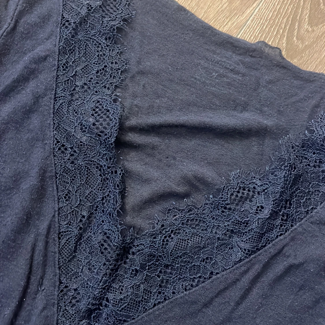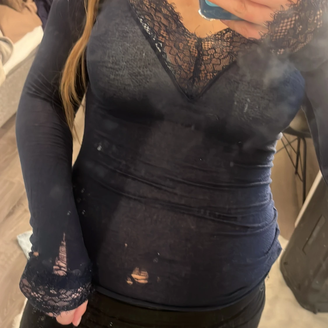 Snygg marin blå långärmad topp med v-ringning och spetsdetaljer runt halsen. Perfekt för en stilren look. Toppen är gjord i ett mjukt material som känns skönt mot huden.två hål ett vid magen och ett vid armen